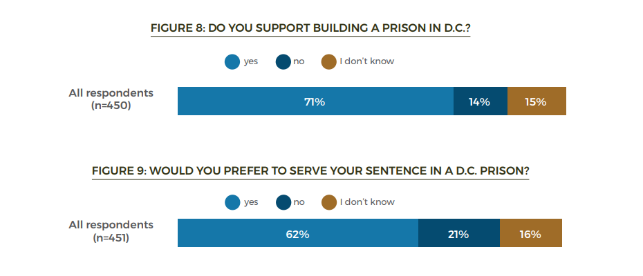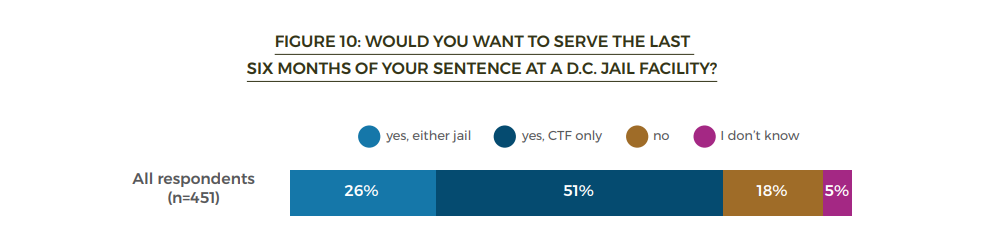 Of the 452 people incarcerated in federal prisons reached by the task force’s November 2020 survey, a majority said they would prefer to serve their sentence in a prison located in the District. More than three quarters of the respondents said they would prefer to return to a D.C. Jail facility for the last six months of their sentence if given the option—but of those, two thirds said they would only want to do it if they could stay at the newer, lower-security Correctional Treatment Facility and not the D.C. Jail.