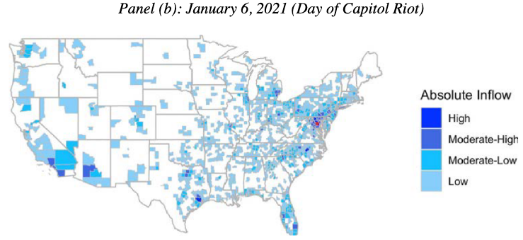 The findings suggest that local restrictions play an important role in mitigating COVID-19 spread around large public gatherings. More than 40% of D.C. residents stayed home full-time between Jan. 5 and Jan. 7, cell phone data show. On the day of the riots, about 22% of cell phone pings captured downtown came from residents of Maryland and Virginia.