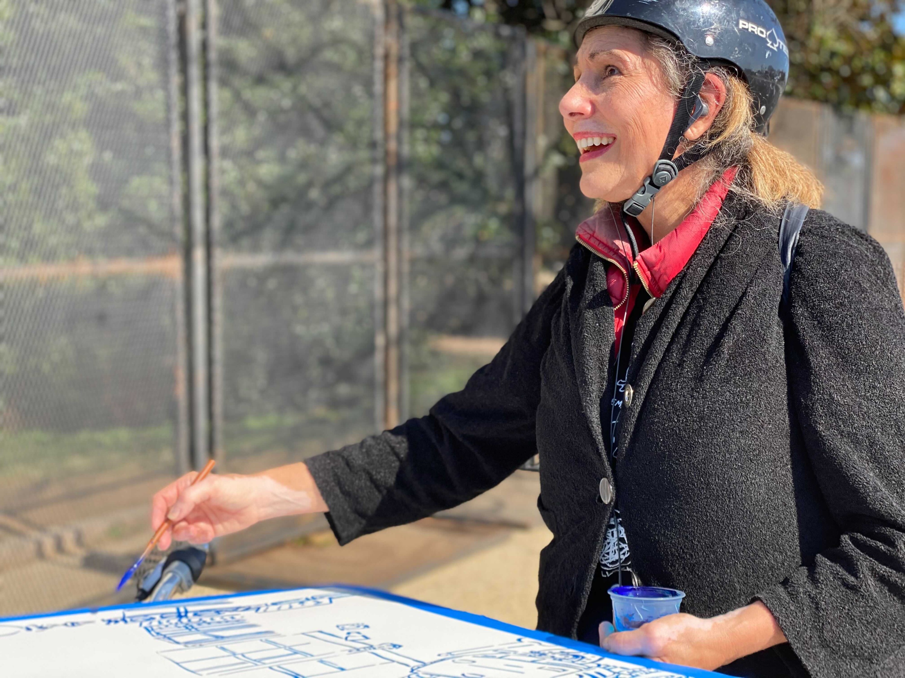 “I’ve got to paint fast! These guys are moving so quickly,” Ludwig says while standing over her folding bike and balancing a piece of white cardboard on a sidewalk post just next to the fence.