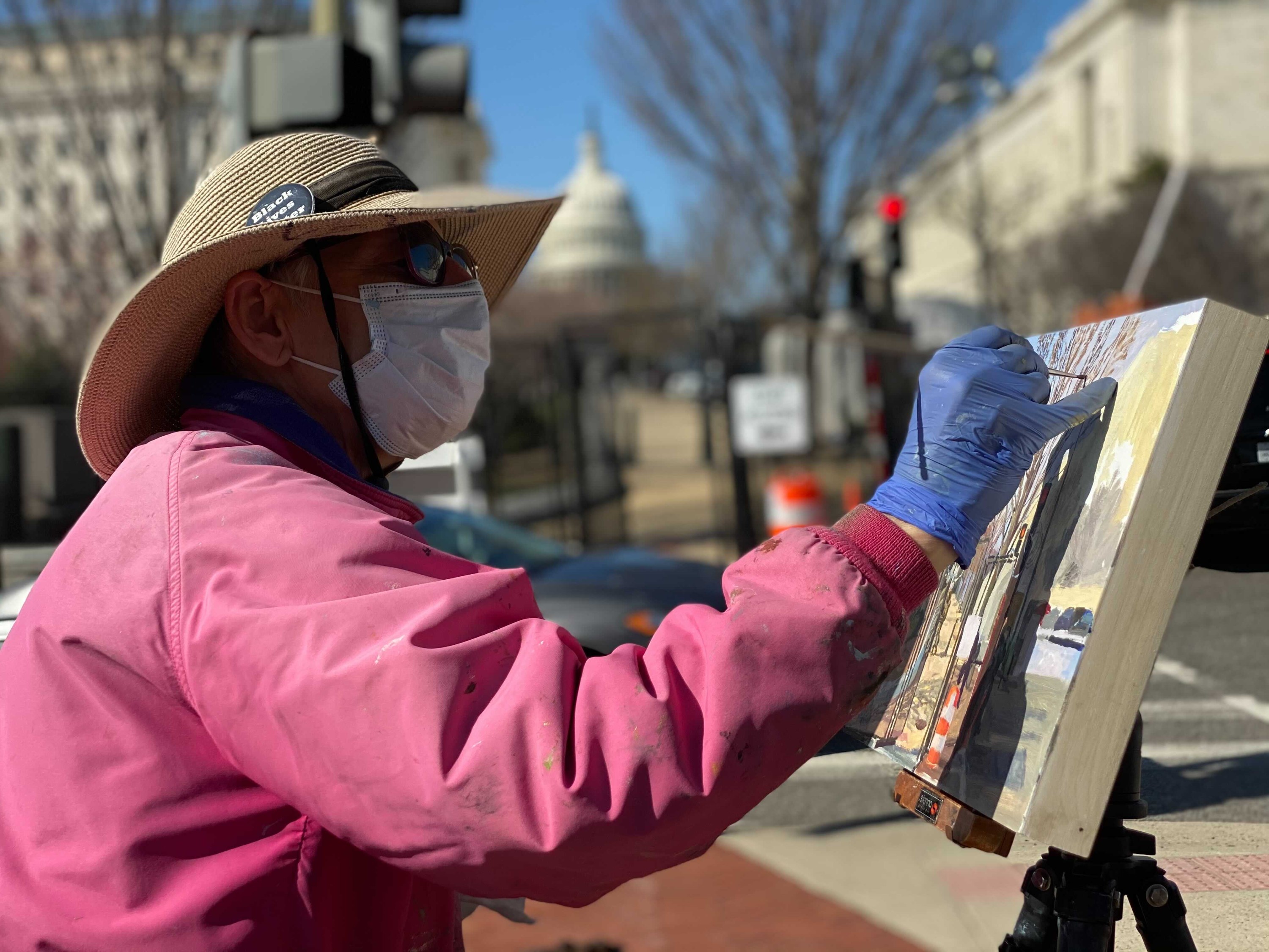 Another local artist, Elaine Wilson from Silver Spring, stands at an easel on the corner of D St. and New Jersey Ave. SE. Wilson has been working on her painting of the Capitol with the fencing around it for a couple of weeks.