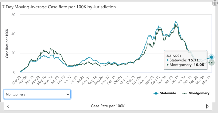 Montgomery County officials, critical of Hogan’s leniency, issued a more measured reopening order similar to Prince George’s County, ending curfews on alcohol sales and increasing indoor capacity limits on most restaurants and businesses from 25% to 50%. The county has seen its average infection rate stay around 10.0 since mid-March.