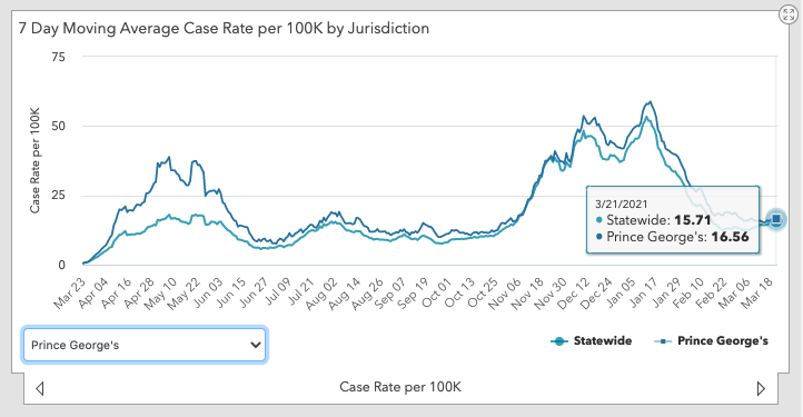 Prince George’s County has maintained a case rate above that of the state for nearly the entire pandemic, but in recent weeks the gap has narrowed. On March 1, the county reported an average case rate per 100,000 residents of 17.2, compared to the statewide rate of 13. On March 22, the county’s case rate was 16.7, compared to the statewide rate of 15.7. Instead of completely lifting capacity limits on indoor businesses, which Hogan recently permitted statewide, Prince George’s County increased its limit from 25% to 50%.