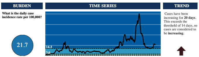 In the Northern Virginia suburbs, the city of Alexandria and Loudoun County have seen especially large increases in their coronavirus metrics in recent weeks. In Alexandria, the average number of new cases per 100,000 residents increased from 9.4 on March 10 (the lowest that metric had been since November) to 16 on Monday, March 22. Loudoun County, which saw its average new infection rate dip below 14 for the first time since mid-November on March 7, is now reporting a rate of 22 cases per 100,000 residents.