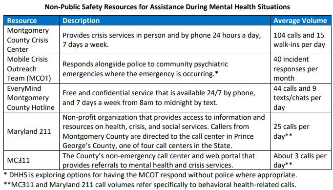While the system provides multiple avenues through which residents can get access to behavioral health resources, each agency is overwhelmed. Montgomery County police alone respond to an average of 19 mental health situations daily, and these calls take longer than other 911 calls, according to a study by the county’s Office of Legislative Oversight.