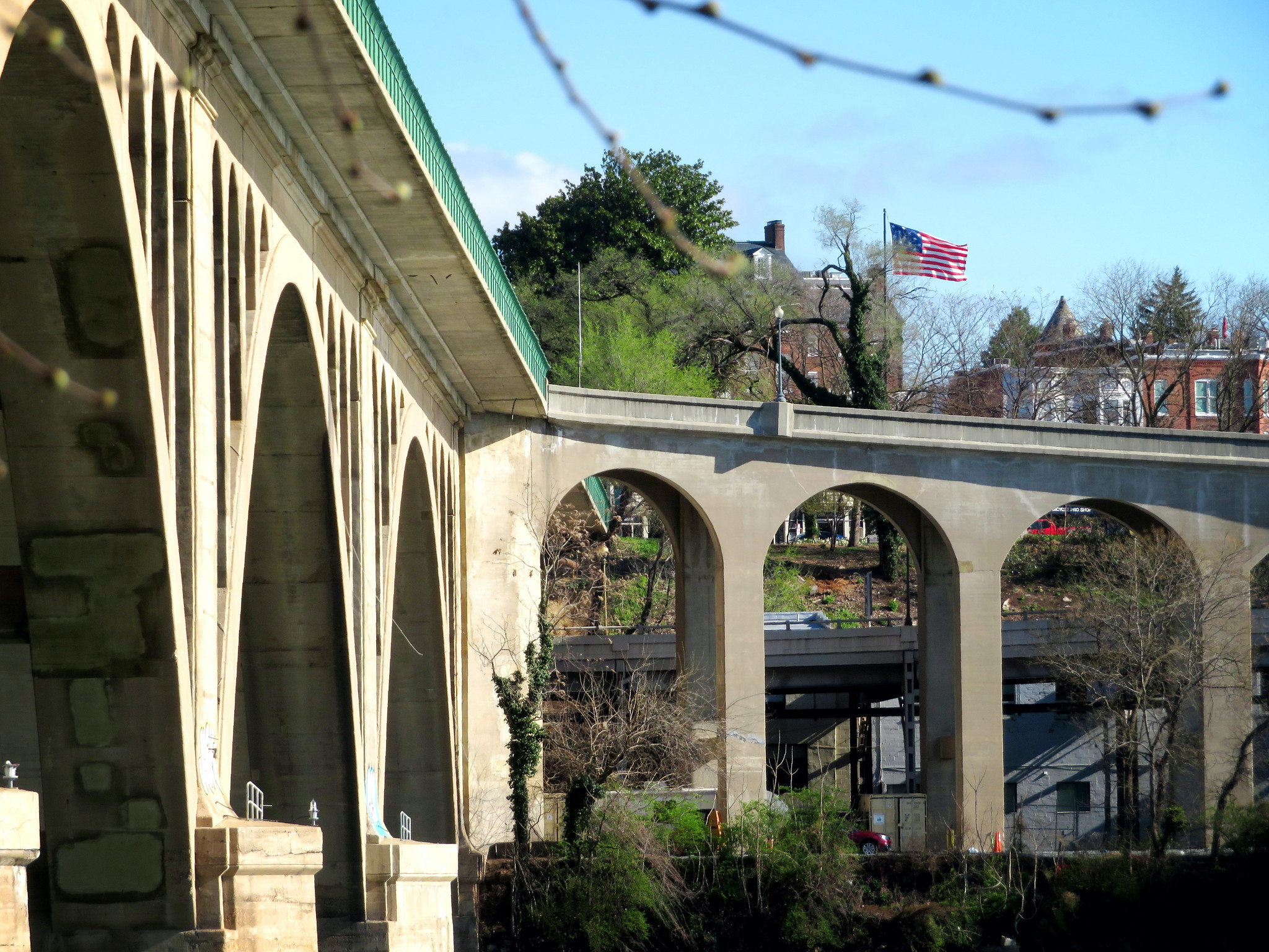 The flag at Francis Scott Key Memorial Park waves above the ramp to the Whitehurst Freeway, just where it comes off Key Bridge.