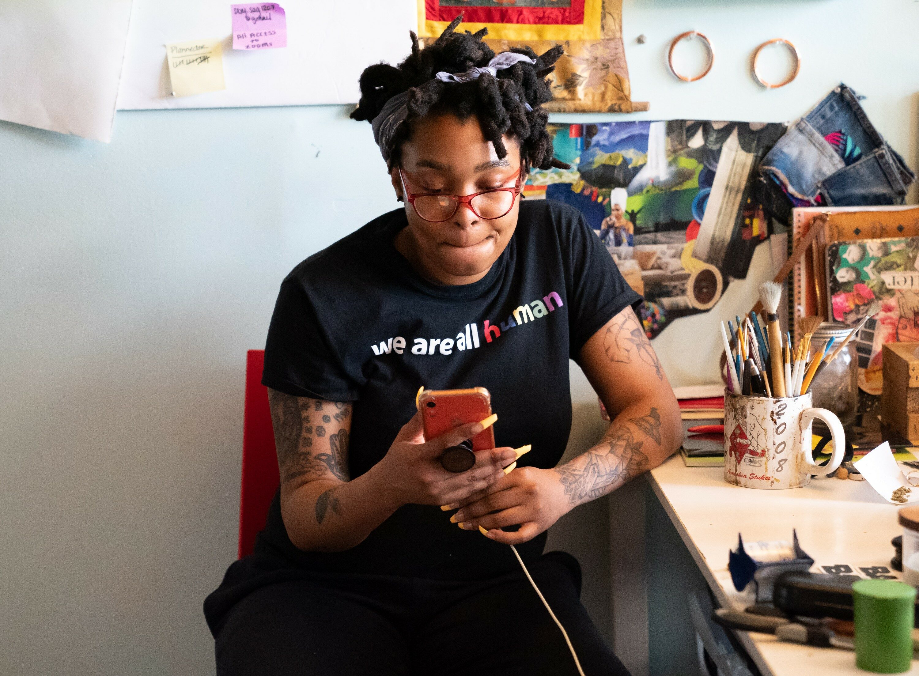Jones and her ex-husband co-raise their kids, and on days when she’s in charge, the kids stay busy Facetiming their cousins and friends, reading stories aloud, napping, or playing educational games on their iPad. It’s a balancing act: On weekdays, Jones signs the kids into Zoom classes at Anne Beers Elementary at 8:30 a.m., then she books clients for tattoos and custom prints.