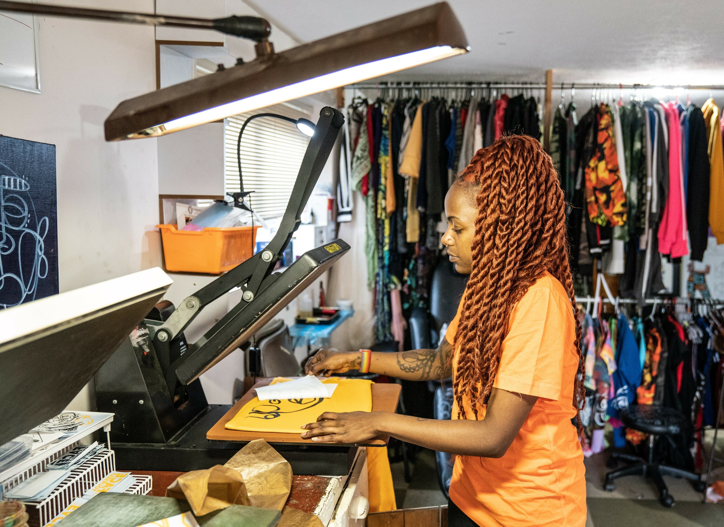 A news radio producer-turned artist and entrepreneur, Jones was one of the seven D.C. artists the mayor’s office called upon to paint the Black Lives Matter Plaza mural overnight in August. Her other work includes a political banner for the Emerson Collective’s Word on the Street series that she created with the help of refugee textile workers in Texas. It reads “Face Yourself — Healing Starts Within,” and is part of her general thesis that one must heal internally before teaching others how to heal. She’s a fashion designer, stylist, printmaker, photographer, podcaster, and tattoo artist. (Truly, if it involves any form of creativity, Jones offers her services for it on her website)
