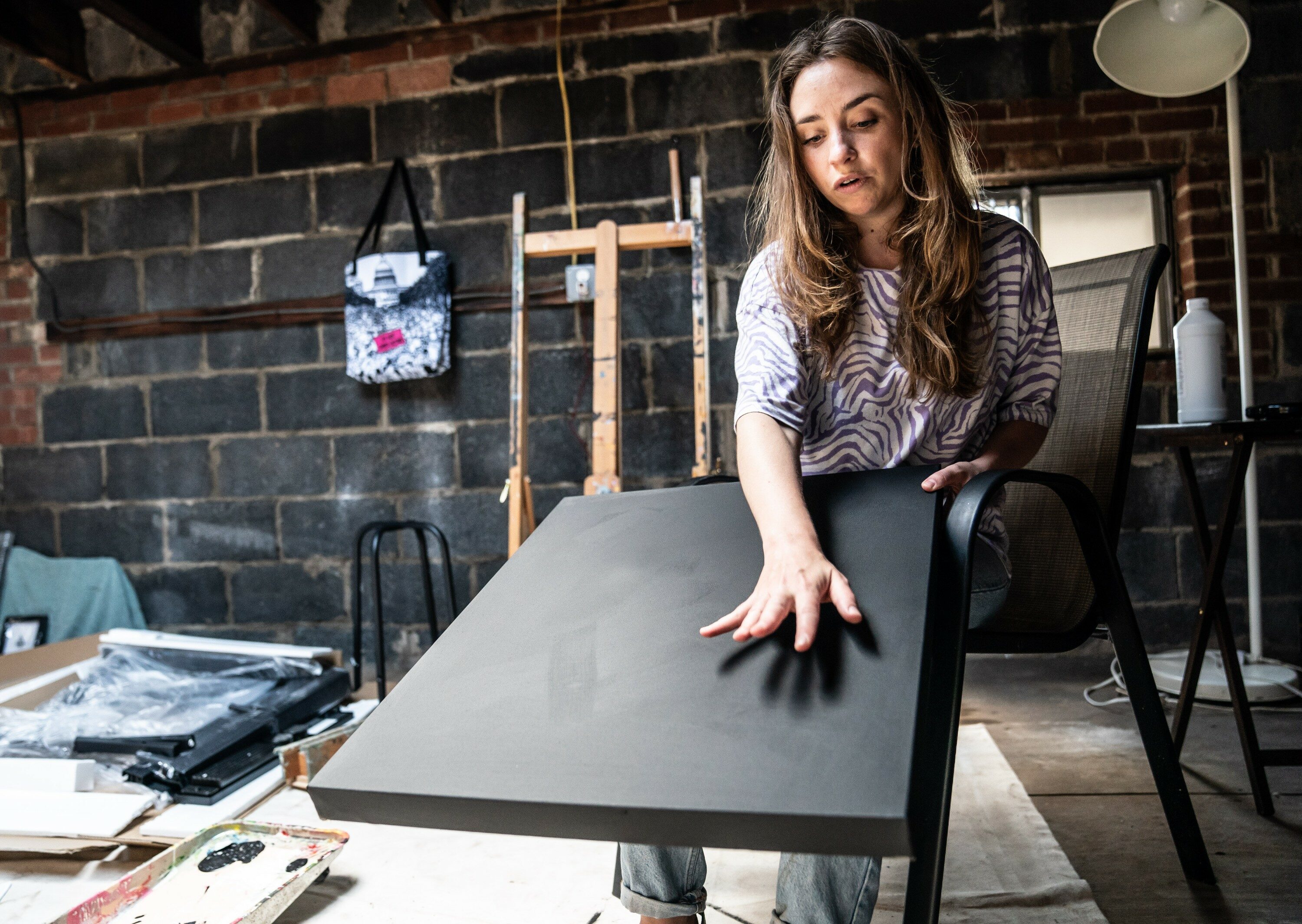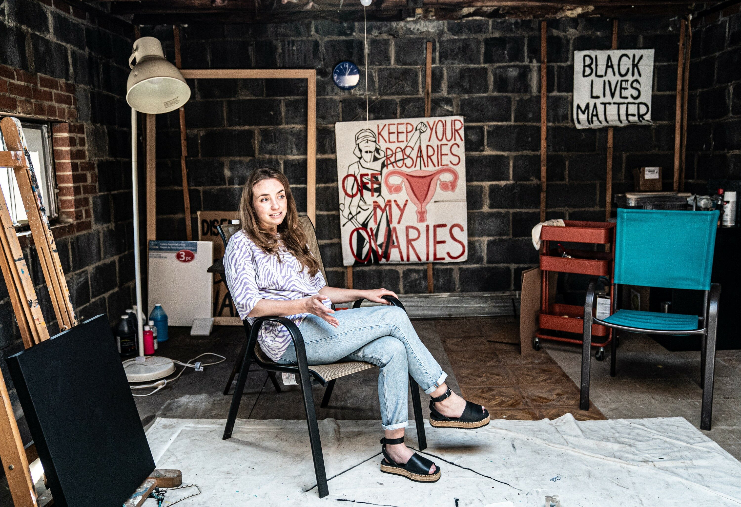 Working out of an old shed in the backyard of her home, Almond carefully conjures up her next projects. Her late-night thoughts — when not focused on dismantling the patriarchy one brush stroke at a time — are with her sister, a trauma nurse at a COVID-19 ward in the U.K., whom she hopes to see once the pandemic ends.