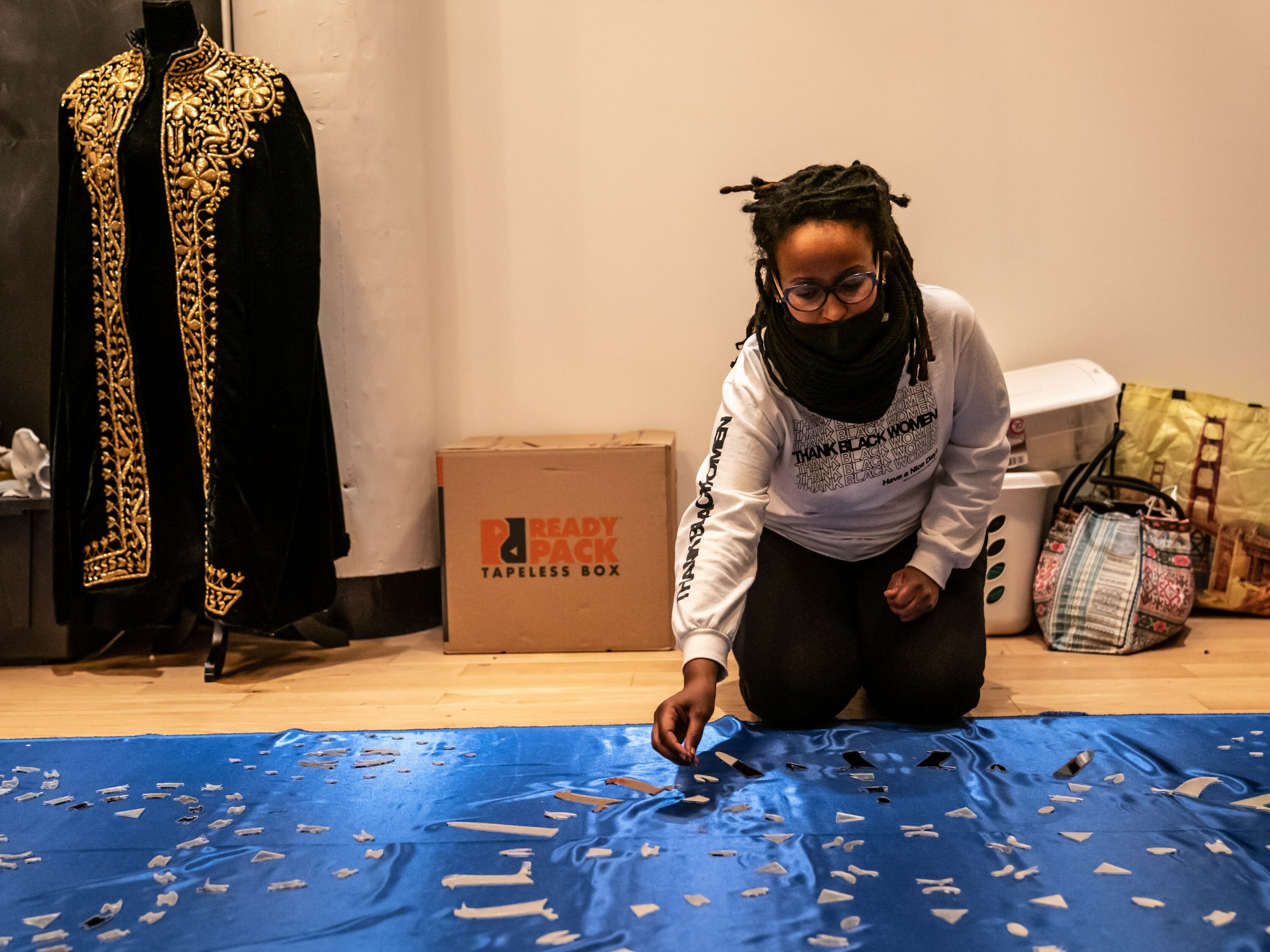 Makonnen gets to work carefully placing mirror acrylic shards on the cloth. The pieces are laser-cut from another project of hers — light sculptures that memorialize women who’ve died while migrating from East Africa across the Mediterranean and Black women who have died at the hands of police brutality in the U.S. She plans to bring the piece to life in videos and live performances — as she’s done with the previous three installments — by wearing the fabric and moving unpredictably so the shards crash and fall off, embodying the violence Black women have endured over time. Makonnen, a 36-year-old raised in Silver Spring, draws upon her Ethiopian heritage, cosmology, and her experiences as a Black mother to create this unfiltered performance art.