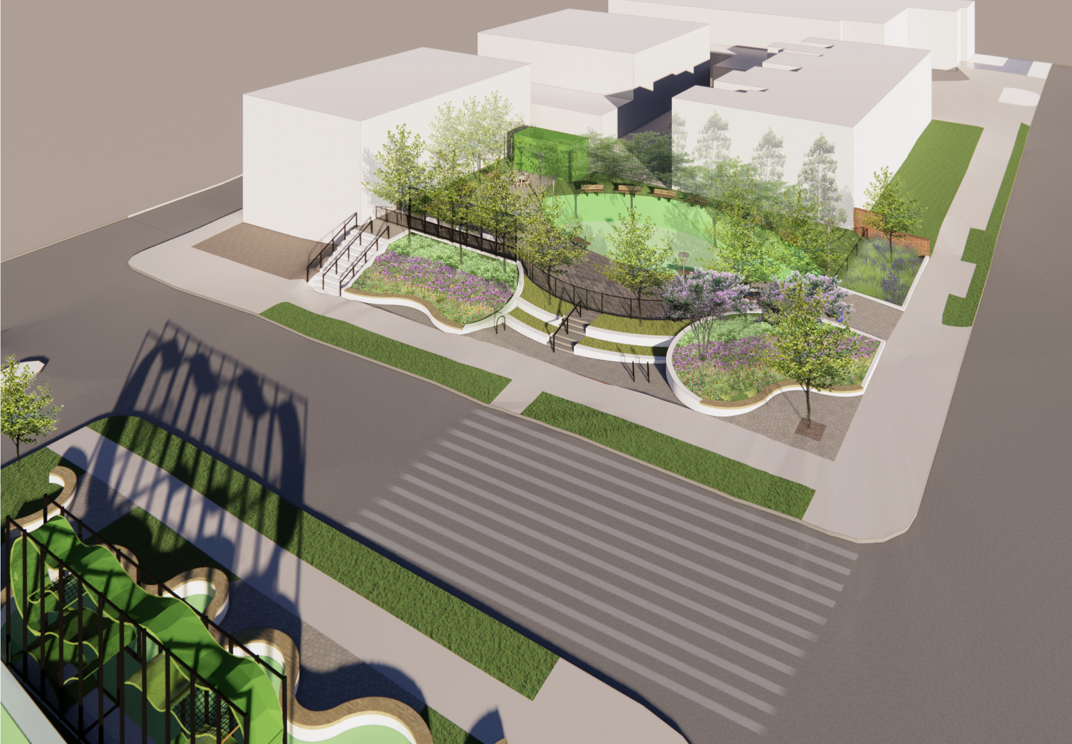NoMa Parks president Robin-Eve Jasper, who also led the NoMa BID until February, said that while neither an overpass or underpass is likely, the foundation is discussing expanded crosswalks or a potential mid-block crossing between the two parks with the District Department of Transportation. In addition, closing the 200 block of L Street NE between the parks once the new space opens is on the table, she added.