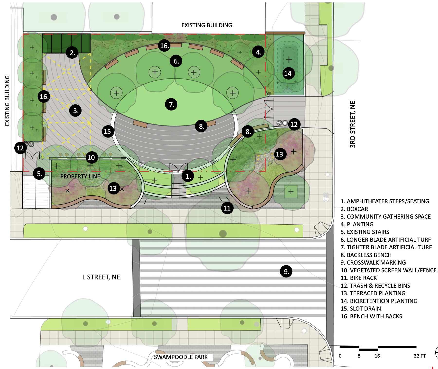 Located at the corner of Third and L streets NE, the space dubbed “Swampoodle II” is planned as a sibling to Swampoodle Park, which opened across the street in 2018. In addition to the boxcar for future programming — think a box for small performances, a pop-up eatery, or storage — the preliminary plans include an amphitheatre-like main entrance and a central oval where toddlers could play or residents do yoga all surrounded by a periphery of greenery.