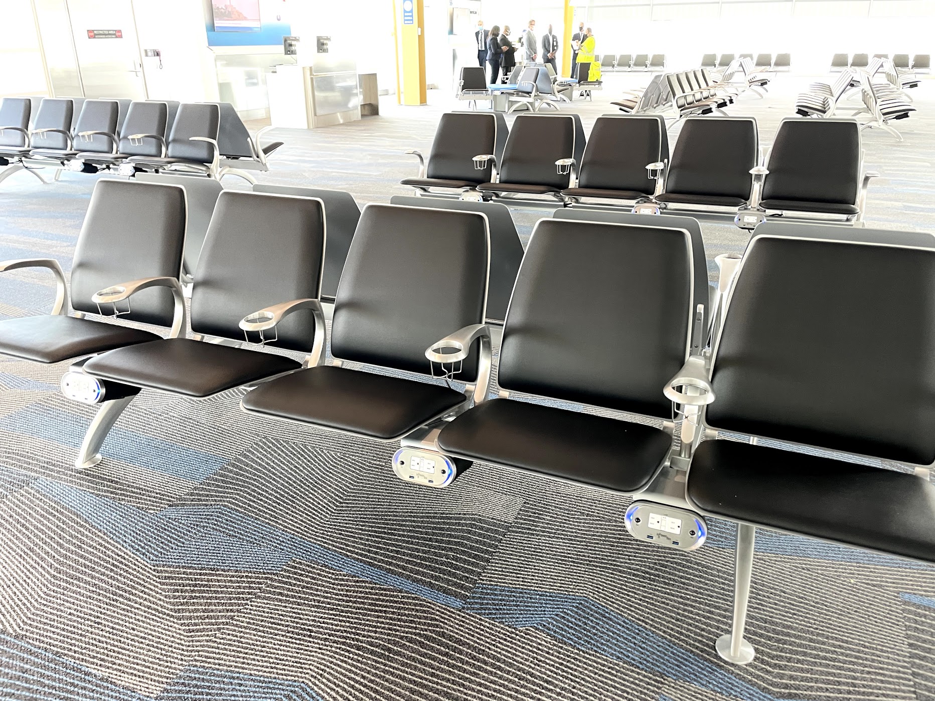 - New types of seating include leather lounge chairs and ottomans at certain gates and pods of seats with tables in the middle.