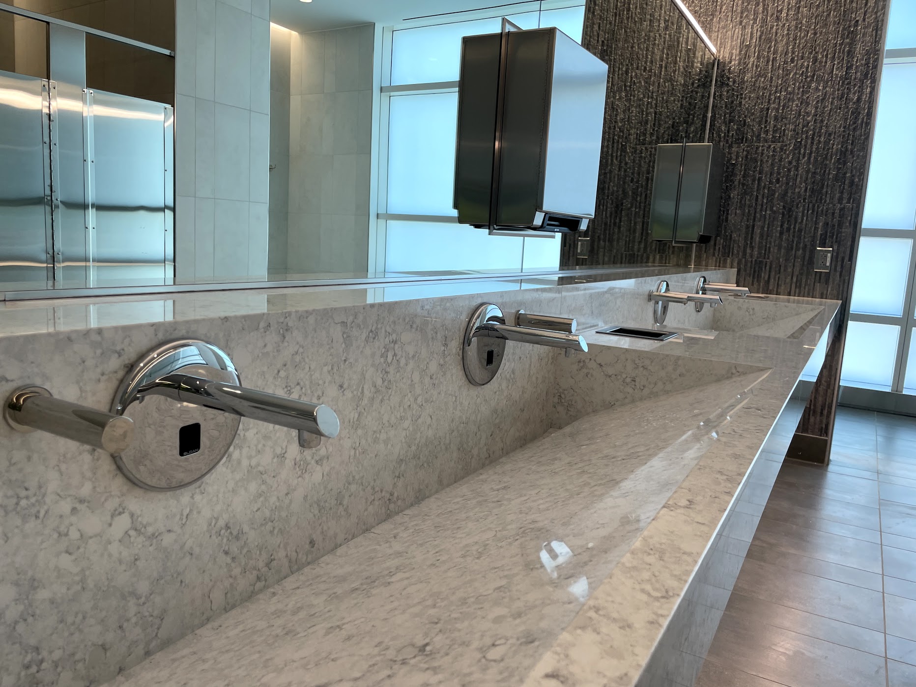 The coronavirus pandemic is still readily apparent with social distancing signs, hand sanitizer stations throughout, and touchless soap, sink and paper towel dispensers in the bathrooms.