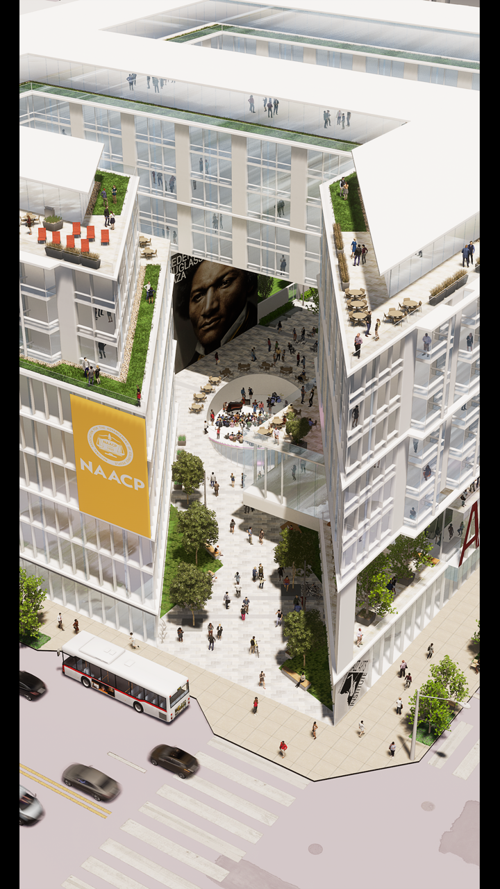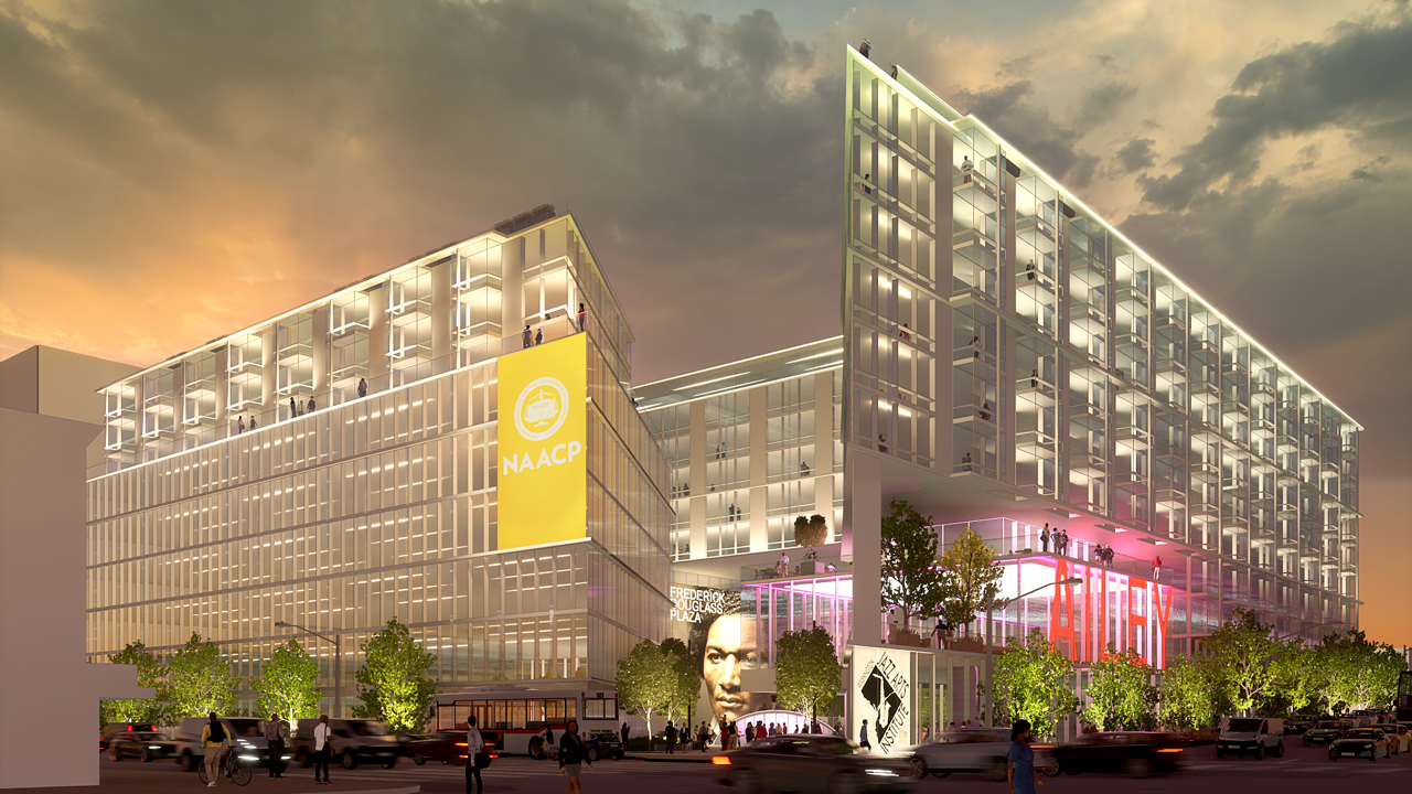 The proposed redevelopment would house the NAACP and other offices on the upper floors while dedicating a percentage of the building to local businesses and nonprofits at below-market rents. It would include 628 units of mixed-income housing units with 30%, or at least 190 units, set aside for people earning 50% or less of the city’s median family income. It would also set aside for-sale townhomes for low-income residents earning less than 50% of the area’s median income.