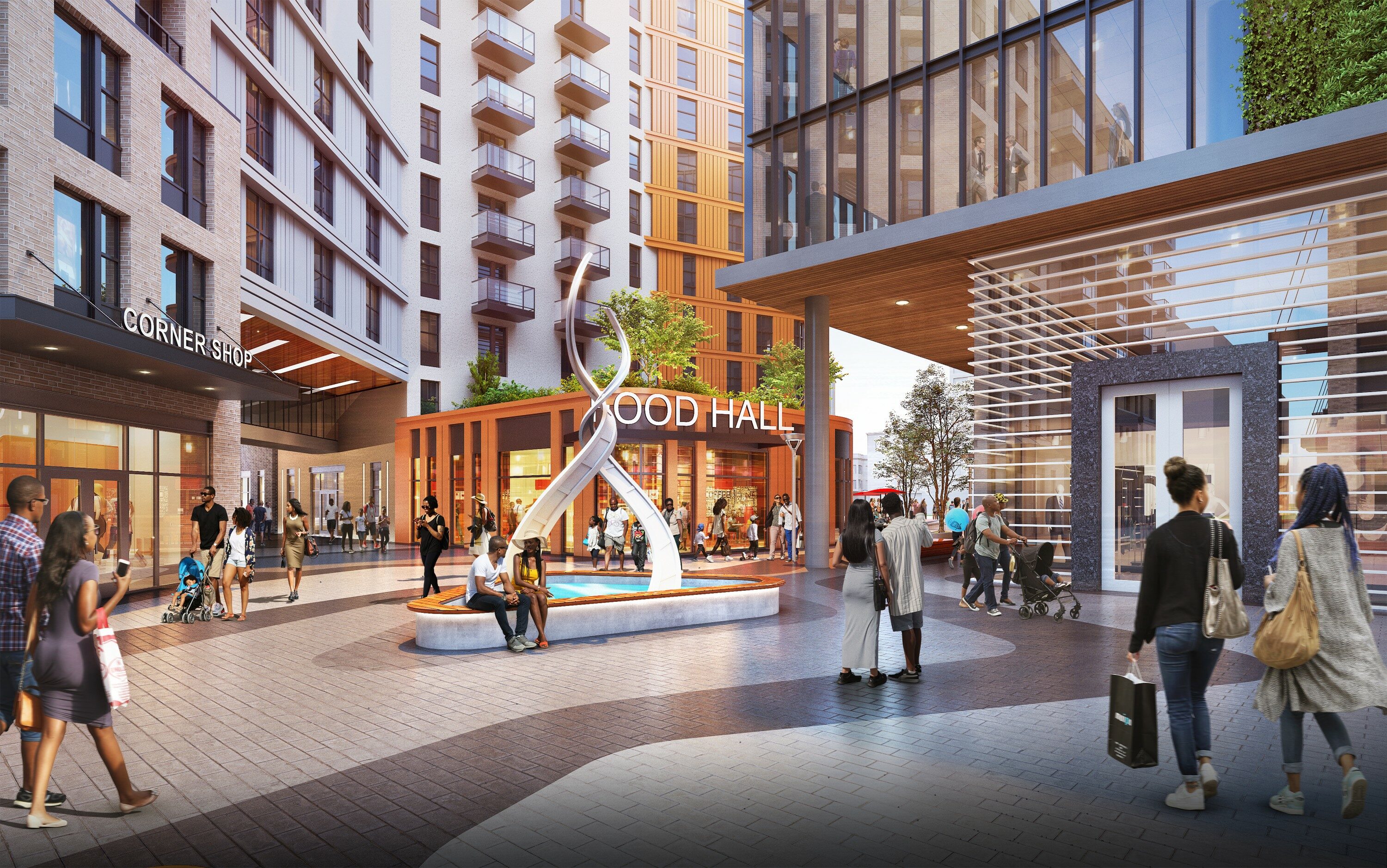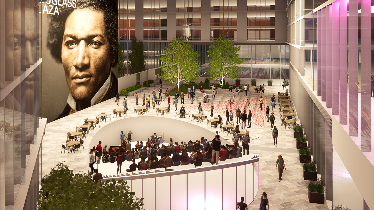 Team One (CSG Urban Partners, Capri Investment Group, and MRP Realty) wants to create an arts and entertainment plaza and amphitheater named after Frederick Douglass and Marion Barry, respectively, at the base of the building, with retail stores and shops surrounding the ground level. The plaza would feature seasonal art installations showcasing local artists and possibly a weekly farmer’s market.