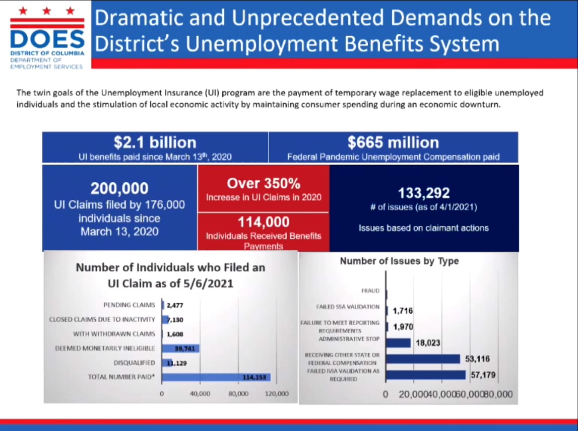The pandemic has brought on what she called an “alphabet soup” of programs, like the Pandemic Unemployment Assistance (PUA) program, and while a number of states reduced benefits or stopped federally funded UI programs altogether, the District adapted to administer seven more benefits programs than in a typical year. Part of an $11 million investment from the city went towards hiring more DOES workers and updating the agency’s technology to accommodate the many changes.