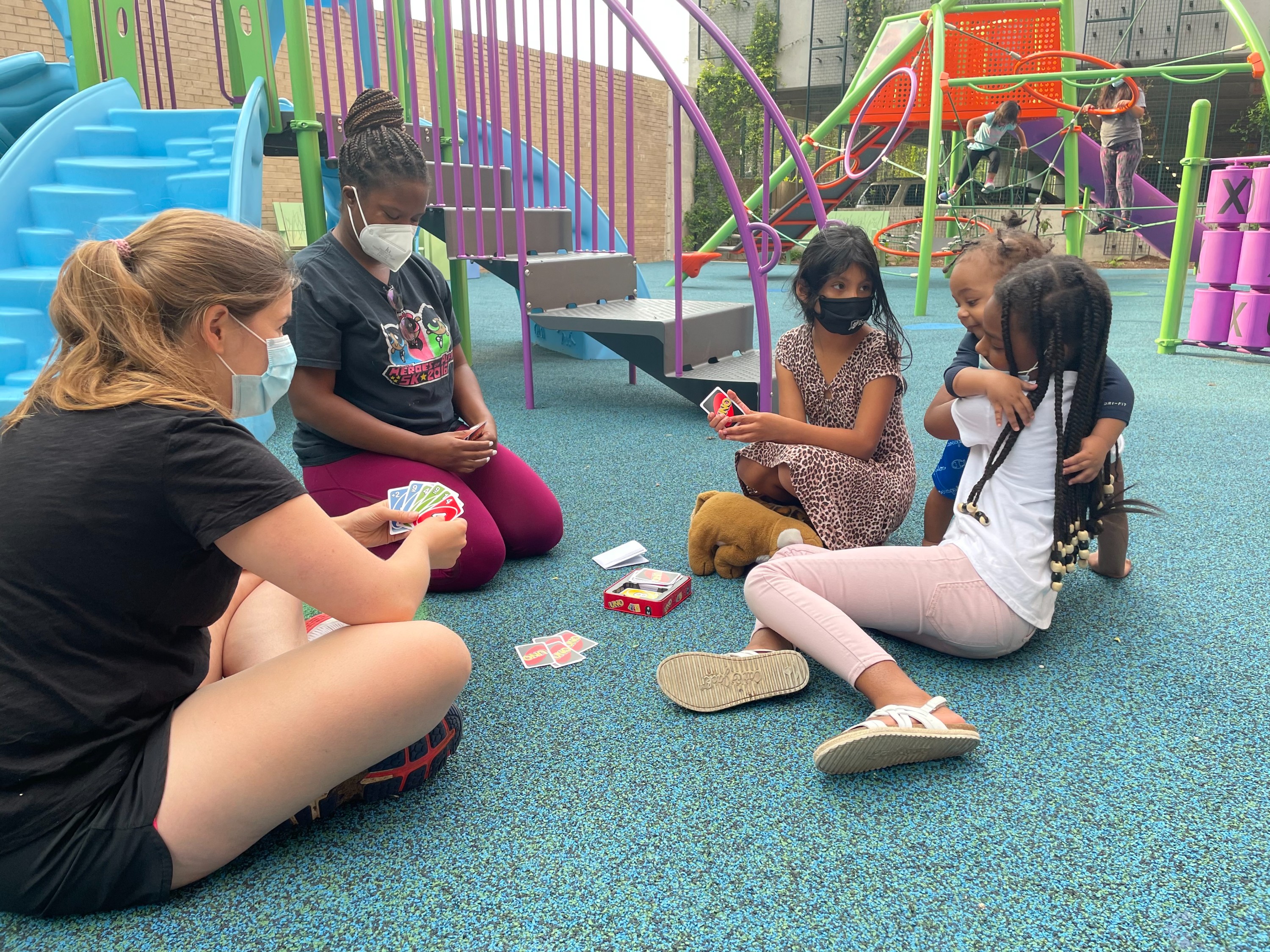 When DCist visited the Brooks in early June, Madison was joined by 9-year-old Evelyn Lopez-Garcia during a Playtime session. Together the pair played Uno, ran away from the cicadas buzzing across the playground, and chased Playtime volunteers and program managers around the jungle gyms.
