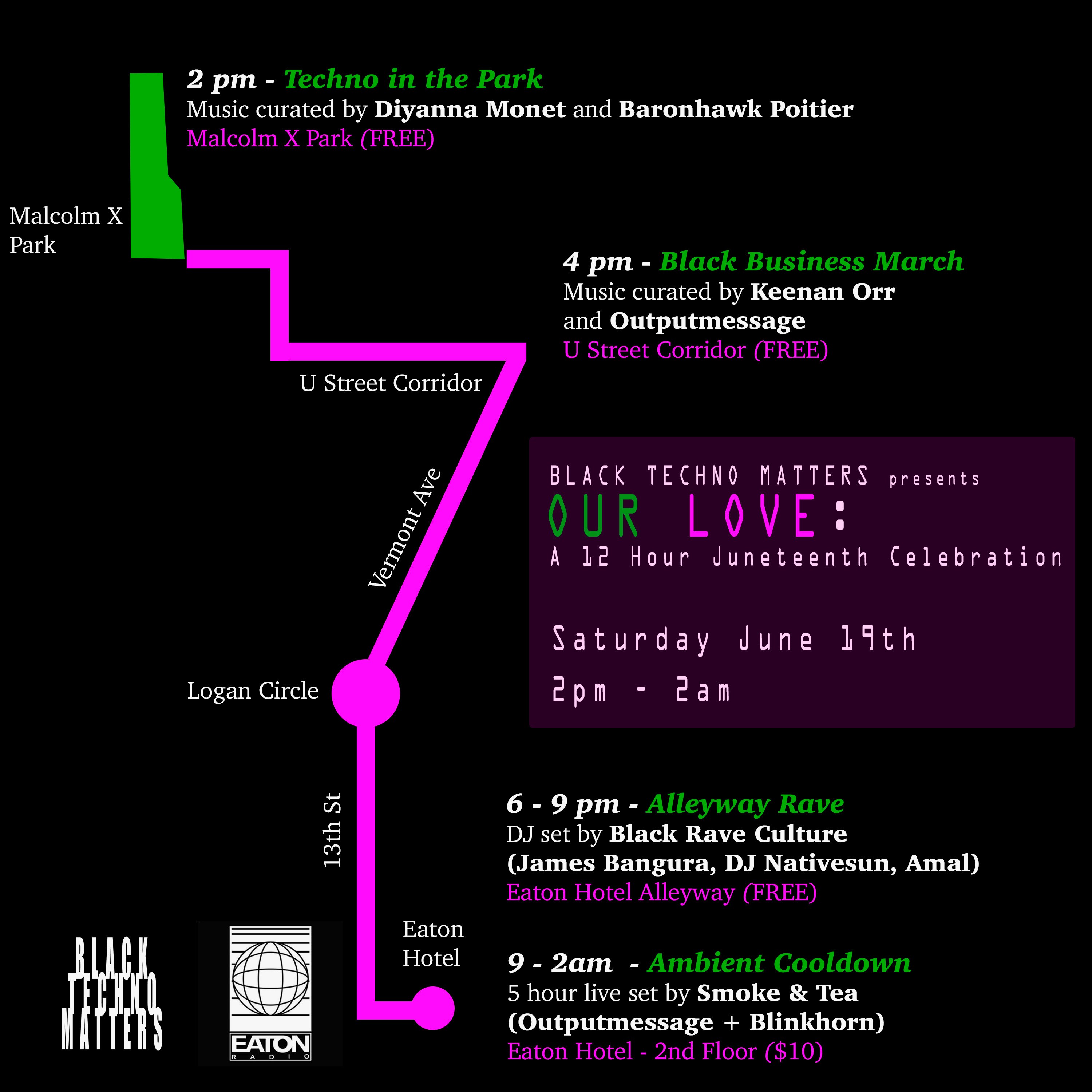 At Kintsugi, the Eaton Hotel’s street-facing cafe, the Freedom Futures Collective — a self-described collective of multimedia activists and artists — is hosting an outdoor performance and open mic event from 4 p.m.-6 p.m. on Saturday. Then, starting at 9 p.m., Black Techno Matters is hosting a five-hour DJ set in one of the hotel spaces, with an ambient, electronic performance by Smoke & Tea. But that’s just the final stop of an all-night party — the group is starting its 12-hour celebration with techno music in Malcolm X Park at 2 p.m., followed by a Black business march on the U Street corridor, and a rave in the Eaton’s alleyway. The hotel will also project images from “Resist Covid Take 6” across its building — the project aims to show the disproportionate effect of the virus on communities of color.