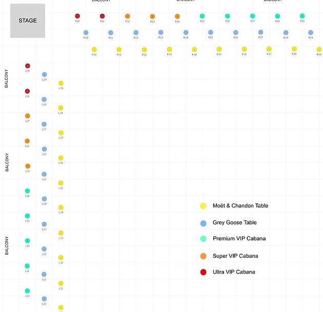 A DJ booth sits at the apex of an upside-down-L-shaped arrangement of tables and cabanas.