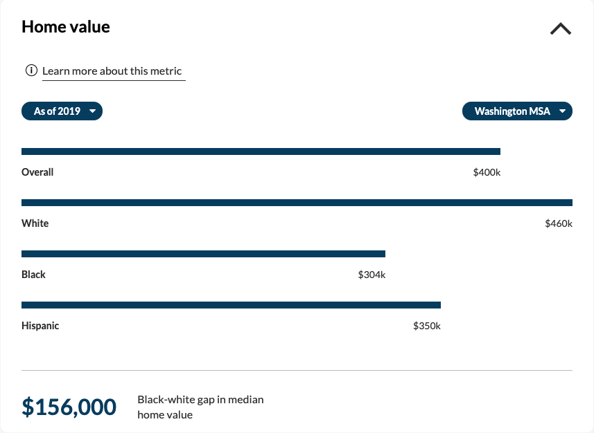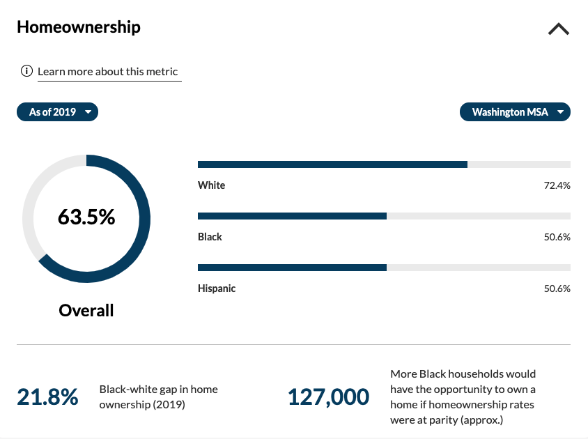 The new tracking page is a product of the Greater Washington Partnership’s newly created Inclusive Growth Strategy Council, a group of business heads tasked with finding solutions to the region’s gaps in equity. The council is co-chaired by Sheila Johnson, CEO of Salamander Hotels & Resorts, and Jason Write, the Washington Football Team president. The dashboard is compiled using data from several federal sources, like the U.S. Census, the Bureau of Labor Statistics, and Federal Reserve economic data, and will be updated every year with the intention of continuously informing policy and business regulation.