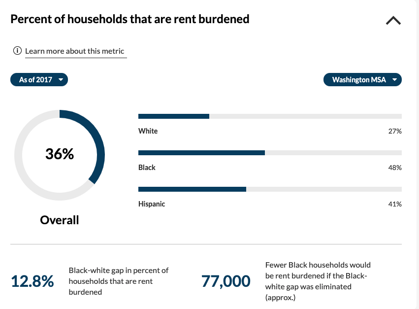 According to the dashboard, 17.7% of Black D.C.-area residents live in racially or ethnically-concentrated areas of poverty, compared to only 1% of white D.C.-area residents. If that gap was closed, the data estimates that 129,000 fewer Black residents would live in a concentrated area of poverty.