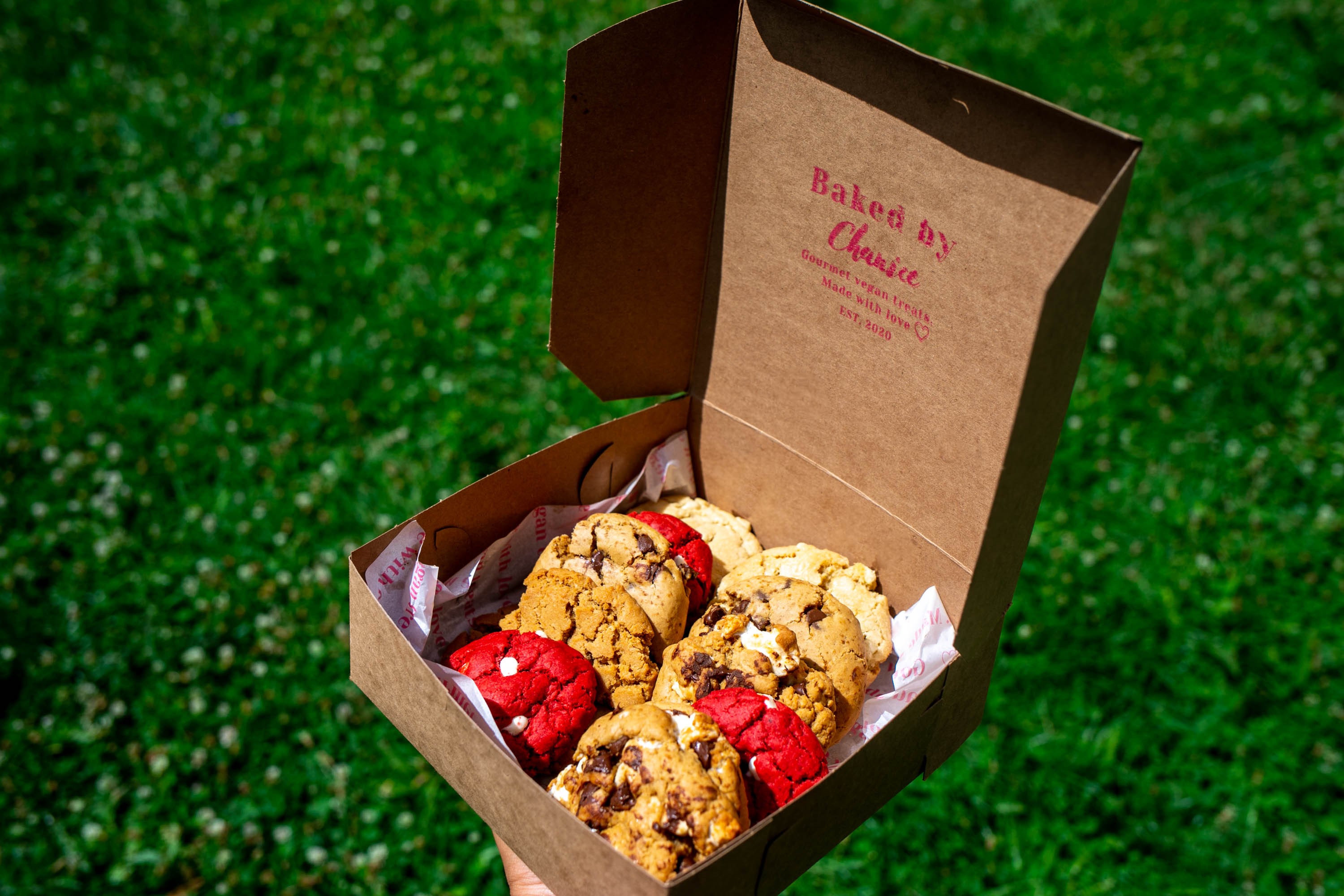 Her parents, Greg and Deidra, also vegans, were her taste testers. It took a few test batches, but they finally gave her the thumbs up for cookies that are crunchy and crispy on the edges, but toothsome and chewy at their centers. From there, she perfected other cookie recipes: red velvet cheesecake, birthday cake, white chocolate macadamia nut, and peanut butter. Now there are more than a dozen flavors in her arsenal.