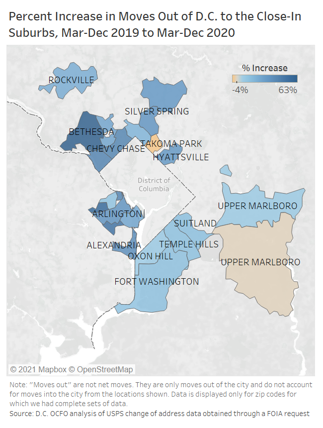 So where did everyone go? It’s hard to say for sure, Moored writes, because USPS data were heavily redacted for privacy reasons. But it looks like many D.C. residents didn’t go far: At least 31% moved to an address within the Washington region, paralleling a national trend of people relocating within the same metro area during the pandemic. Close-in suburbs including Chevy Chase, Bethesda, Silver Spring, Oxon Hill, Alexandria, and Arlington lured three times the number of D.C. residents between March and December 2020 than they did the prior year, according to Moored.