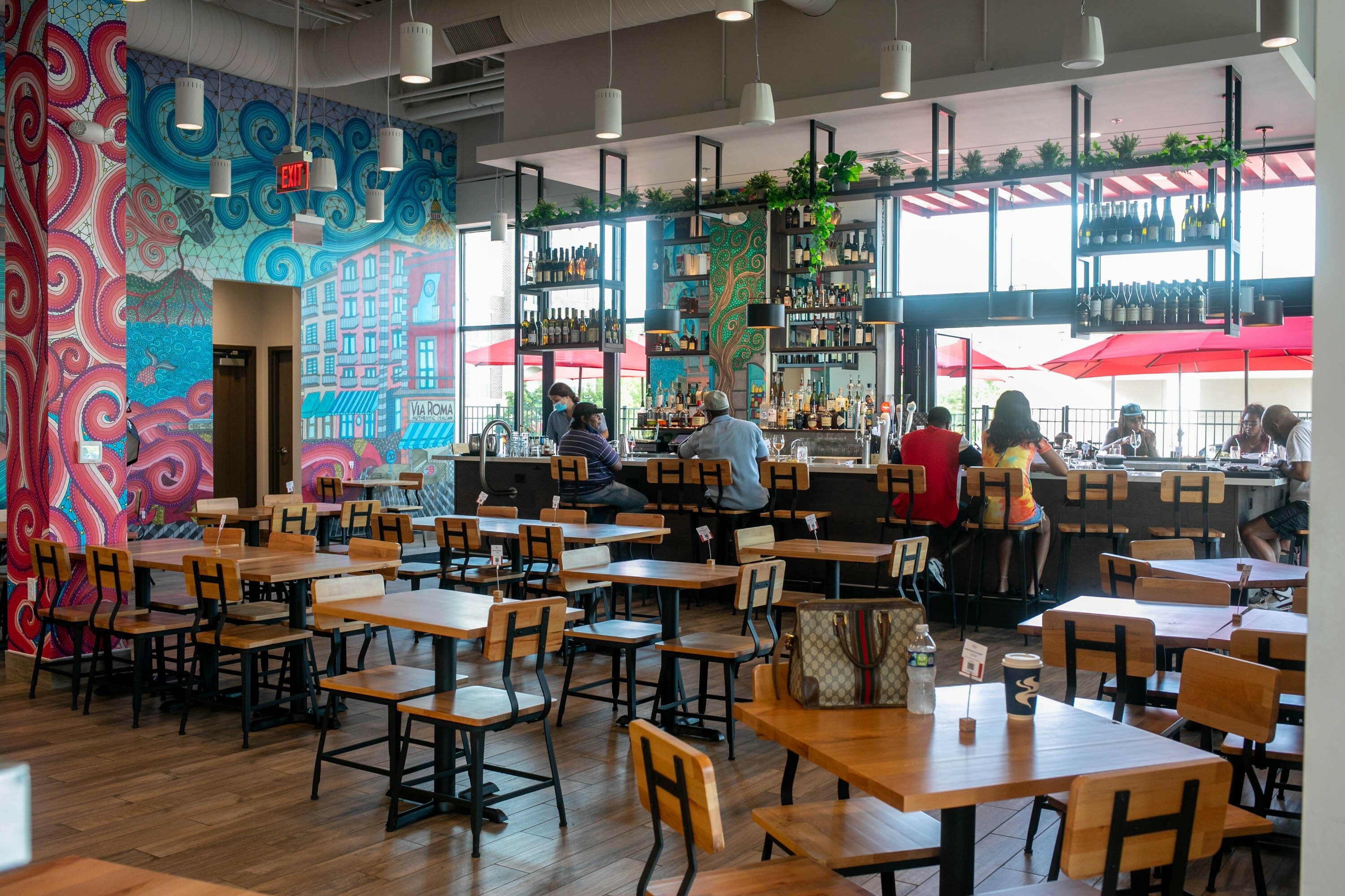 In the morning, a small café counter in the front serves baked goods and Lavazza coffee. Behind it looms the cavernous main room with over 80 seats, complemented by 40 more on the patio. The open kitchen runs along the left side of the room and a small bar is on the right. Reds, whites, and rich woods accent the room, while a colorful, swirling mural in the back captures the restaurant’s namesake street in Naples.