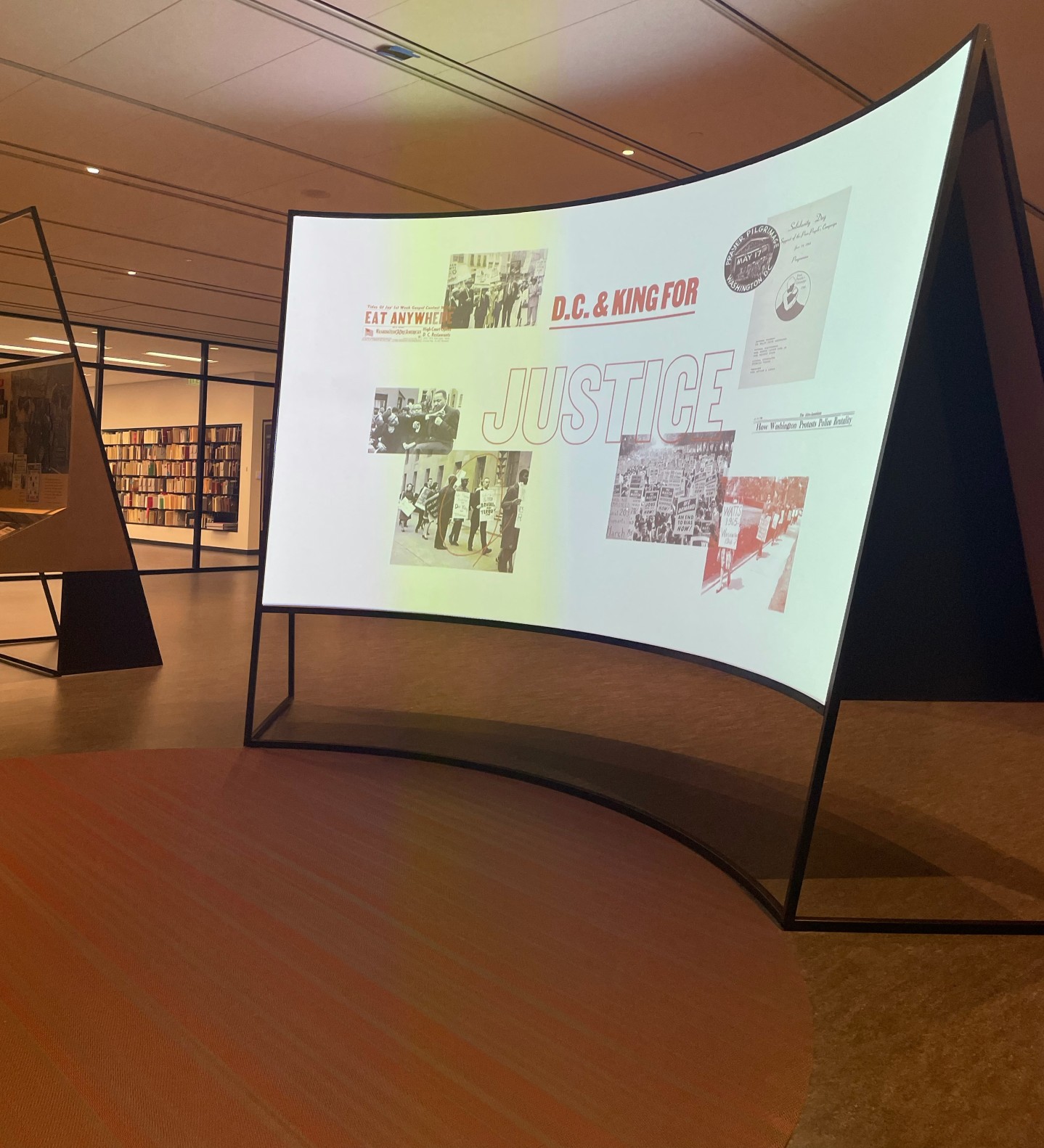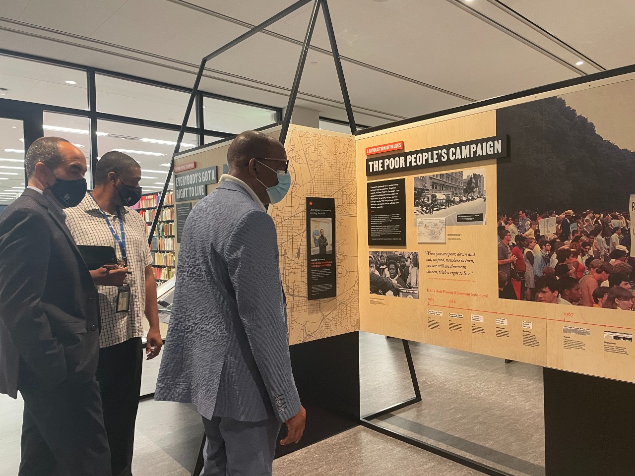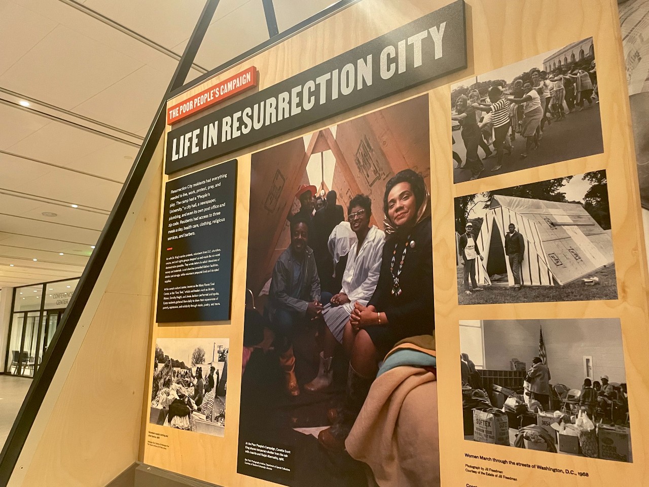 Displays on the Poor People’s Campaign and Resurrection City fill the room, structured in triangular shapes as a nod to the Soul Tent, a hub where residents exchanged poems, songs, and art. In the center of the room, a large projector plays a documentary, narrated in part by a piece of living D.C. history: longtime radio host Kojo Nnamdi (Nnamdi is employed by WAMU, DCist’s parent company, where he hosts the weekly Politics Hour show.)