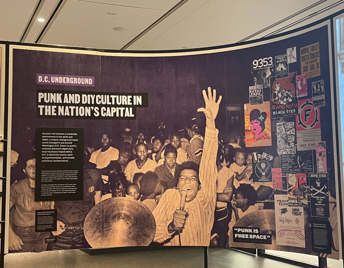 Moving from the west wing to “D.C. Represented” in the east wing, Nnamdi’s voice is replaced with tracks of go-go and funk music. Clips of concerts and interviews with go-go figures like William “Ju Ju” House of E.U. project on one side of the room, while visitors can see old footage of punk shows on the other.