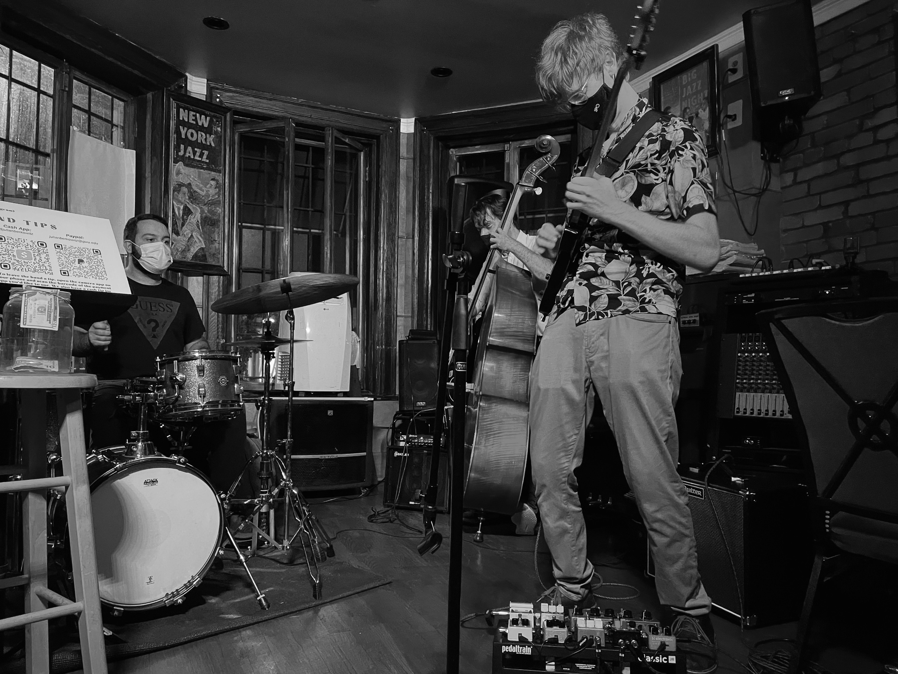 “There’s a fourth member of the band, Phillip the Tip Jar, on bar stool,” Berkowitz tells the handful of patrons. “Thanks for supporting live jazz.”