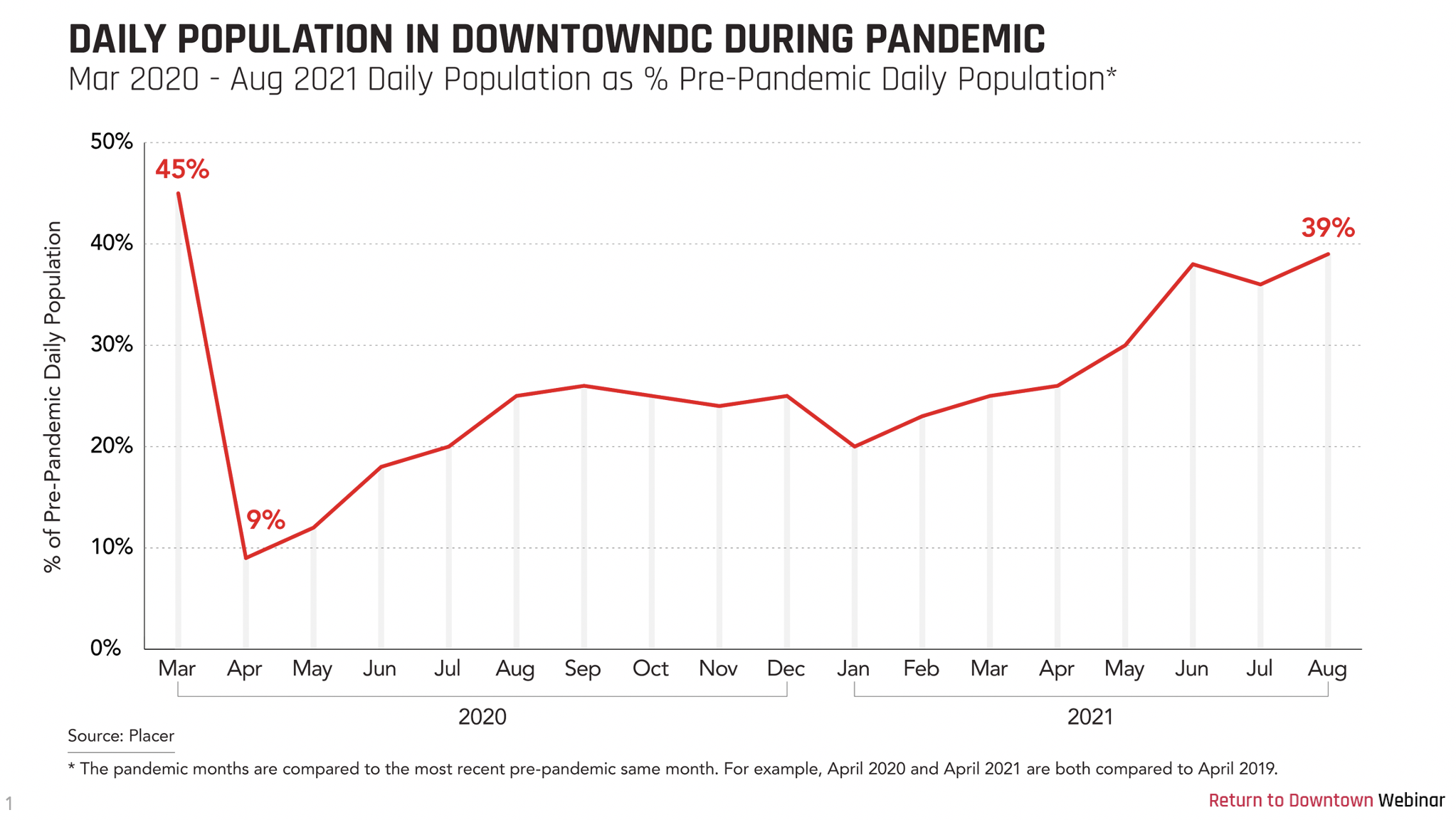 In August, the daily population within the downtown BID’s boundaries was 39% of what it was in August 2019, according to the BID. Hotel room occupancy was down more than 50%. Weekday Metro ridership totaled just 21% of pre-pandemic levels.