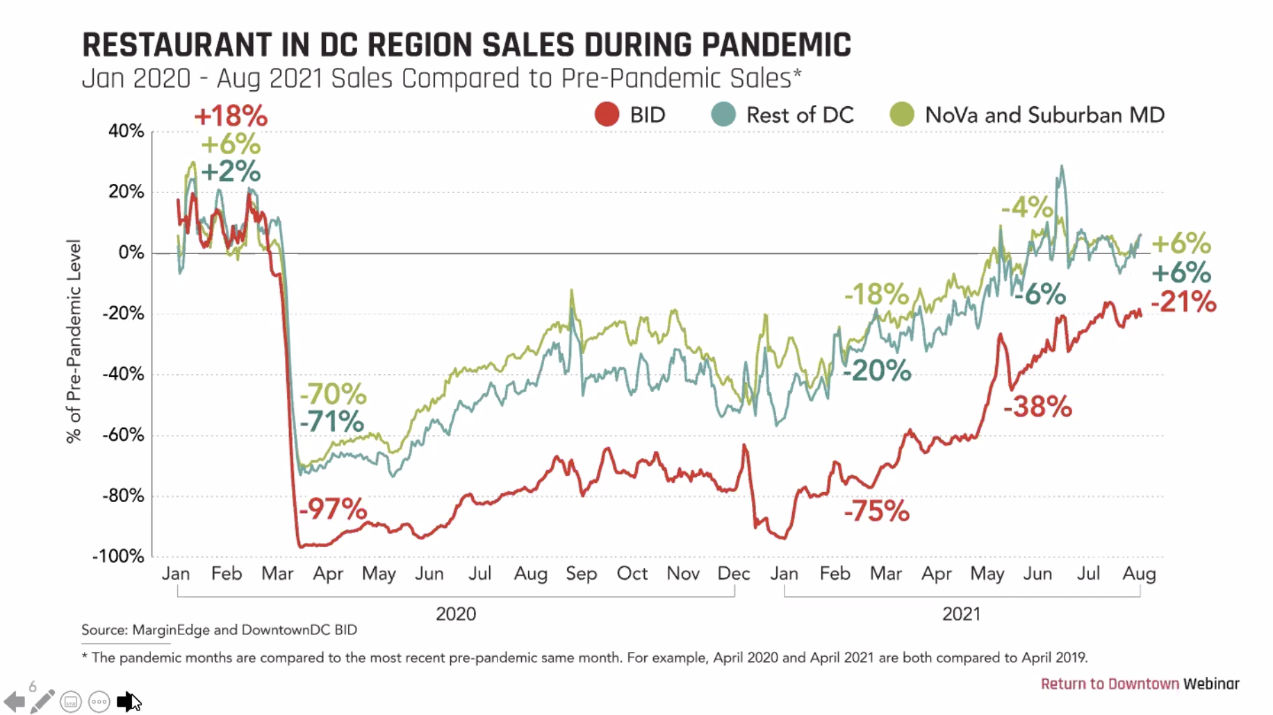 On average, eateries outside of the BID’s boundaries have seen their sales bounce back to pre-pandemic levels. But as office workers continue to do their jobs from home, sales at downtown restaurants in August 2021 were still 21% lower than they were in August 2019.