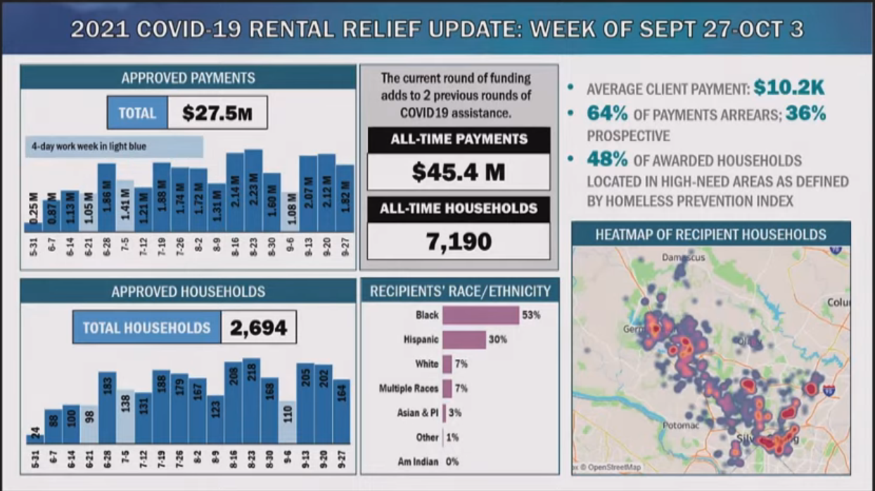 Montgomery County has distributed $27.5 million in federally funded rent assistance since May, according to the health department. The vast majority of people who have received assistance self-identity as Black (53%) or Hispanic (30%), and nearly half live in areas the county considers “high need,” including east county, Gaithersburg, and Germantown.