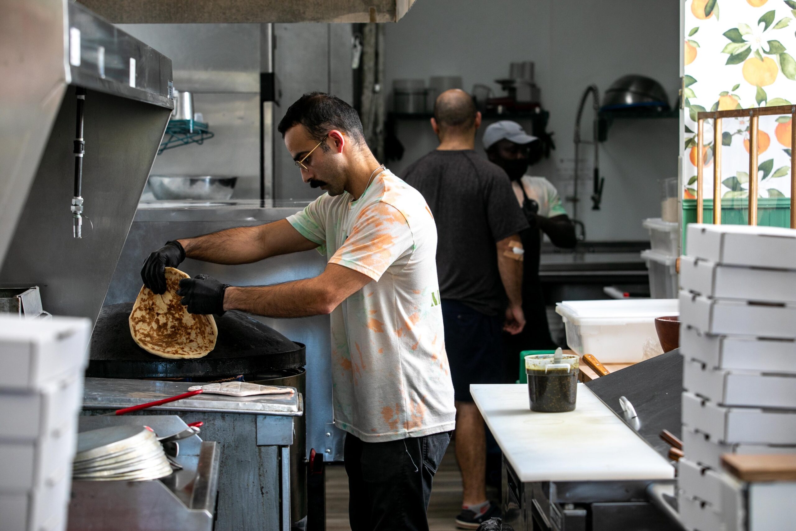 With a swift arc of his arm, Danny Dubbaneh slaps disc-shaped dough on the hot metal dome of the Middle Eastern saj grill. After a minute, he delicately pries it up with his fingers to check its progress, then flips it over to reveal a golden griddling. His goal: “a crispy bottom, but a pillowy top,” he says.