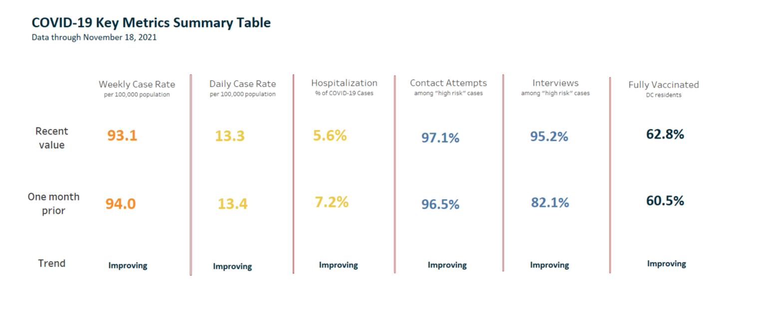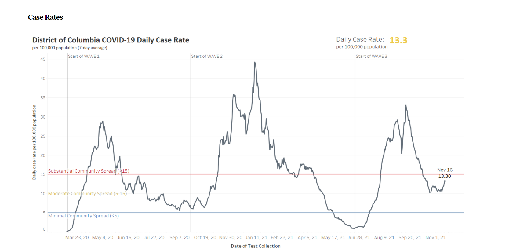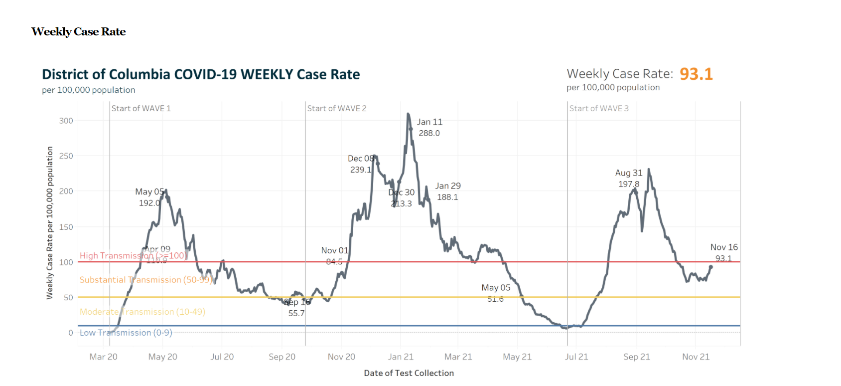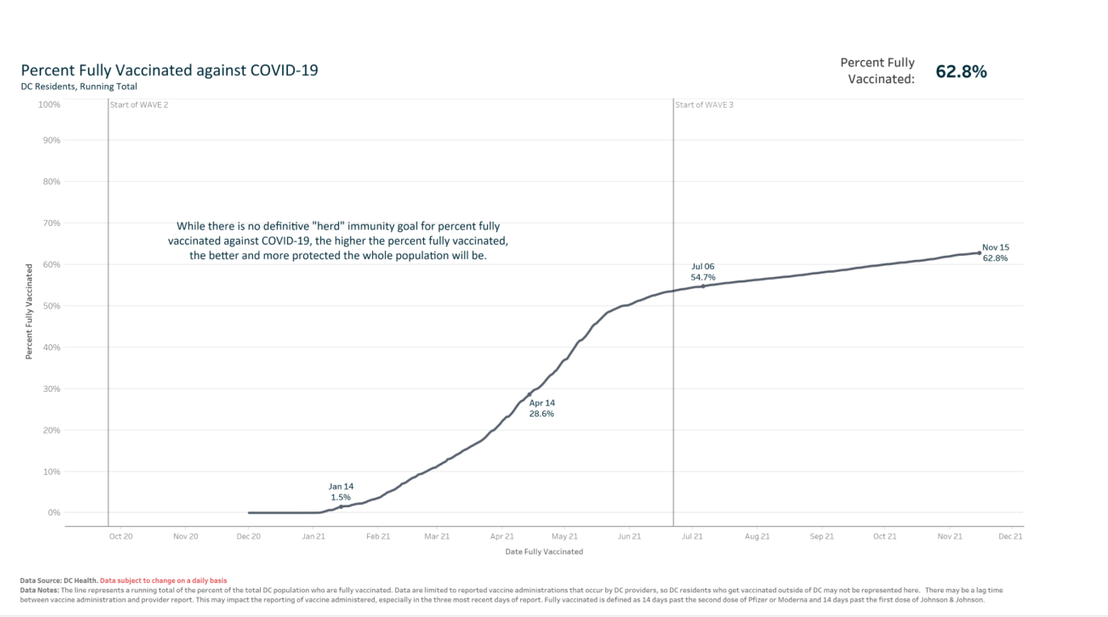 Nesbitt said the percentage of D.C. residents fully vaccinated is another key metric that people should consult when gauging their risk. As of Tuesday, Nov. 22, an estimated 63% of D.C.’s total population has received a vaccine.