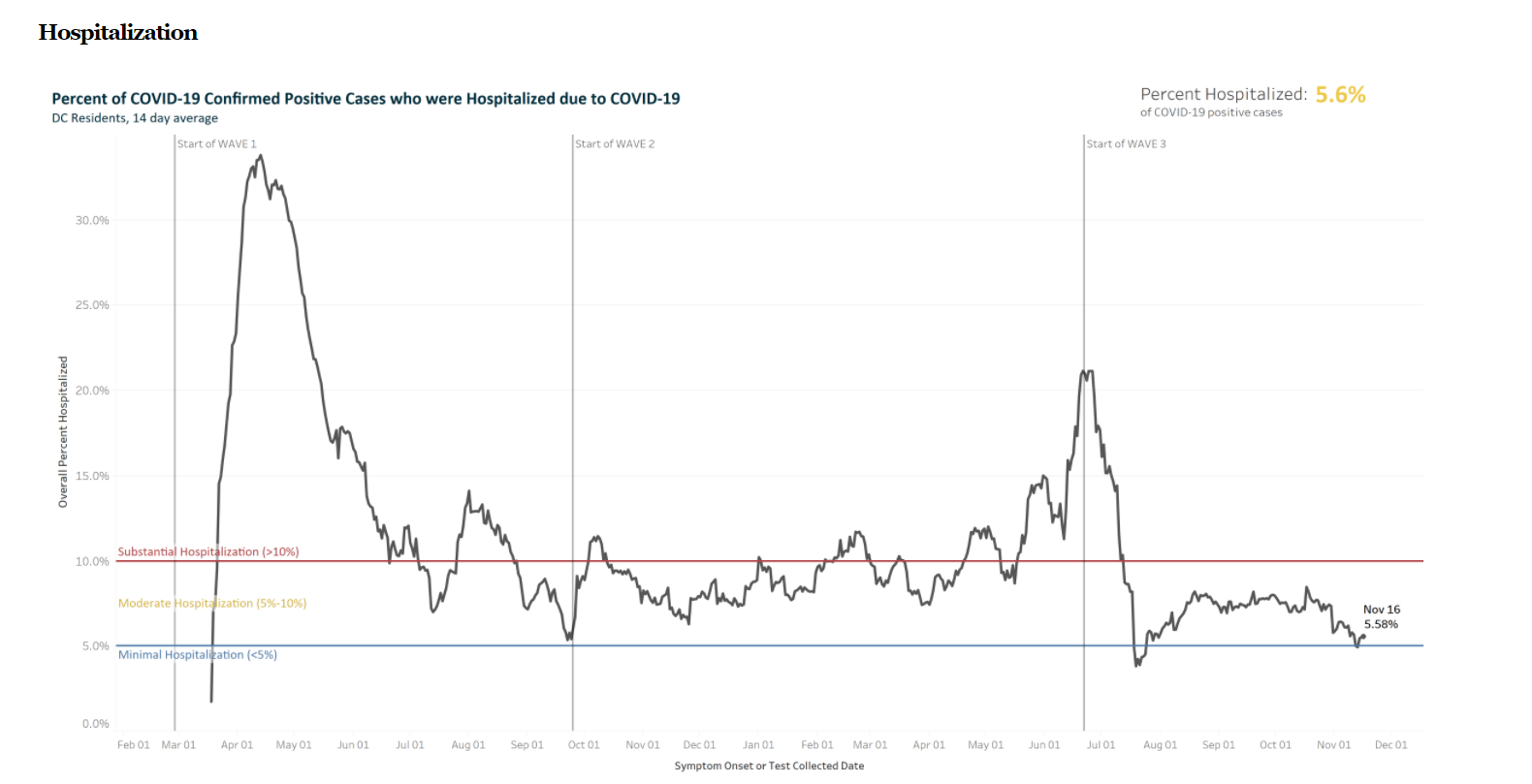 Going forward, D.C. will be publishing the percentage of new positive cases that result in hospitalization — a measure Nesbitt said would be more useful for residents assessing their risk level, as opposed to a metric like the hospital capacity, which the city has been publishing throughout the pandemic.