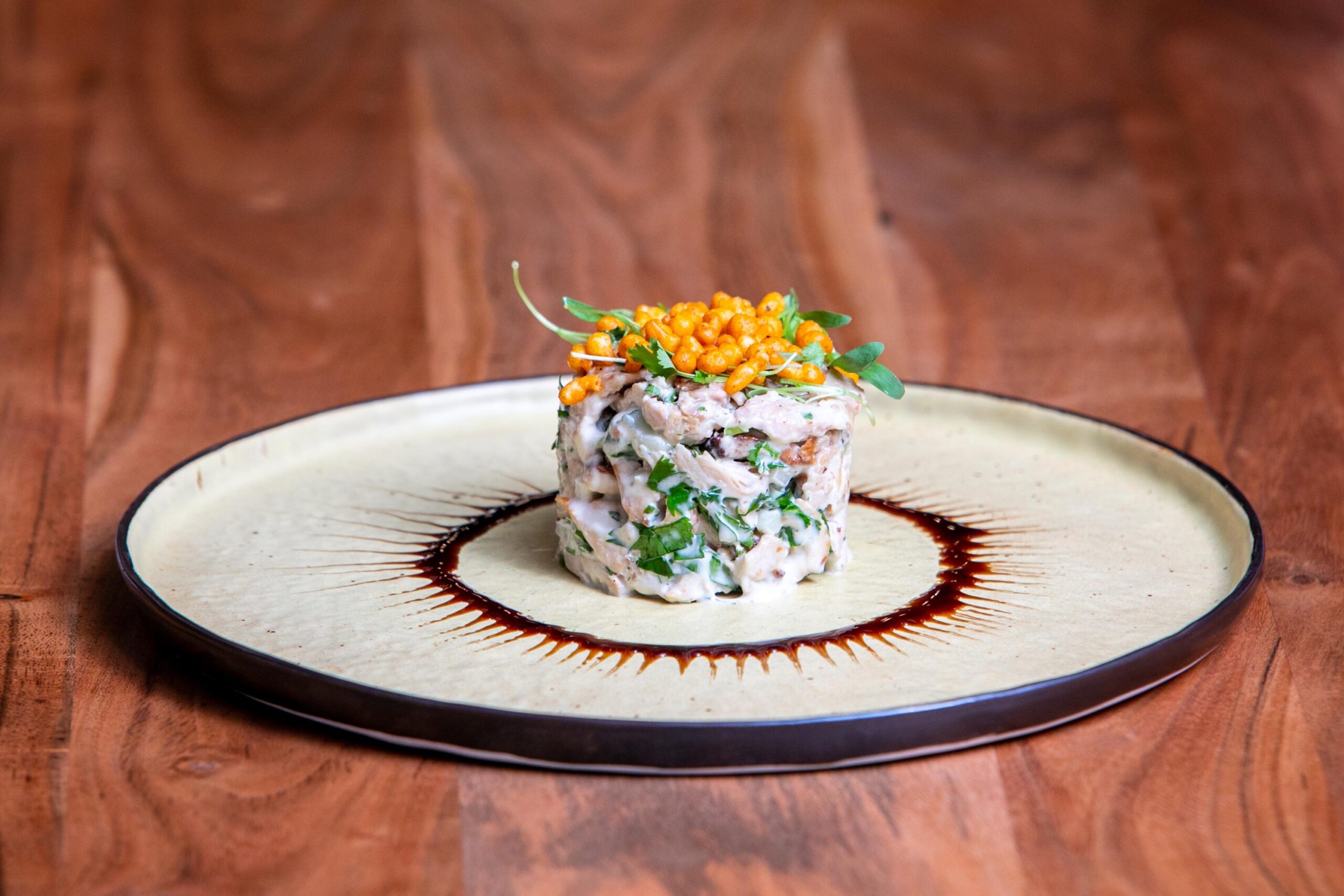 His love of painting carried over to the restaurant’s décor. A couple of modern-minded pieces (none of them his) adorn the walls of space, which relies on nautical-feeling palette of weather white, midnight blue, and ruddy reds. Along the back of the room, there’s a mosaic tiled elevated bar, which offers a handful of beers, a concise wine selection, and a cocktail list split between traditional tipples and house creations – like the honey-sweetened, tequila-powered Autumn Leaves that leans heavily on pumpkin chai shrub for its flavor – and a couple of zero-proof options, including the refreshing, ginger-centric Familiar Faces.