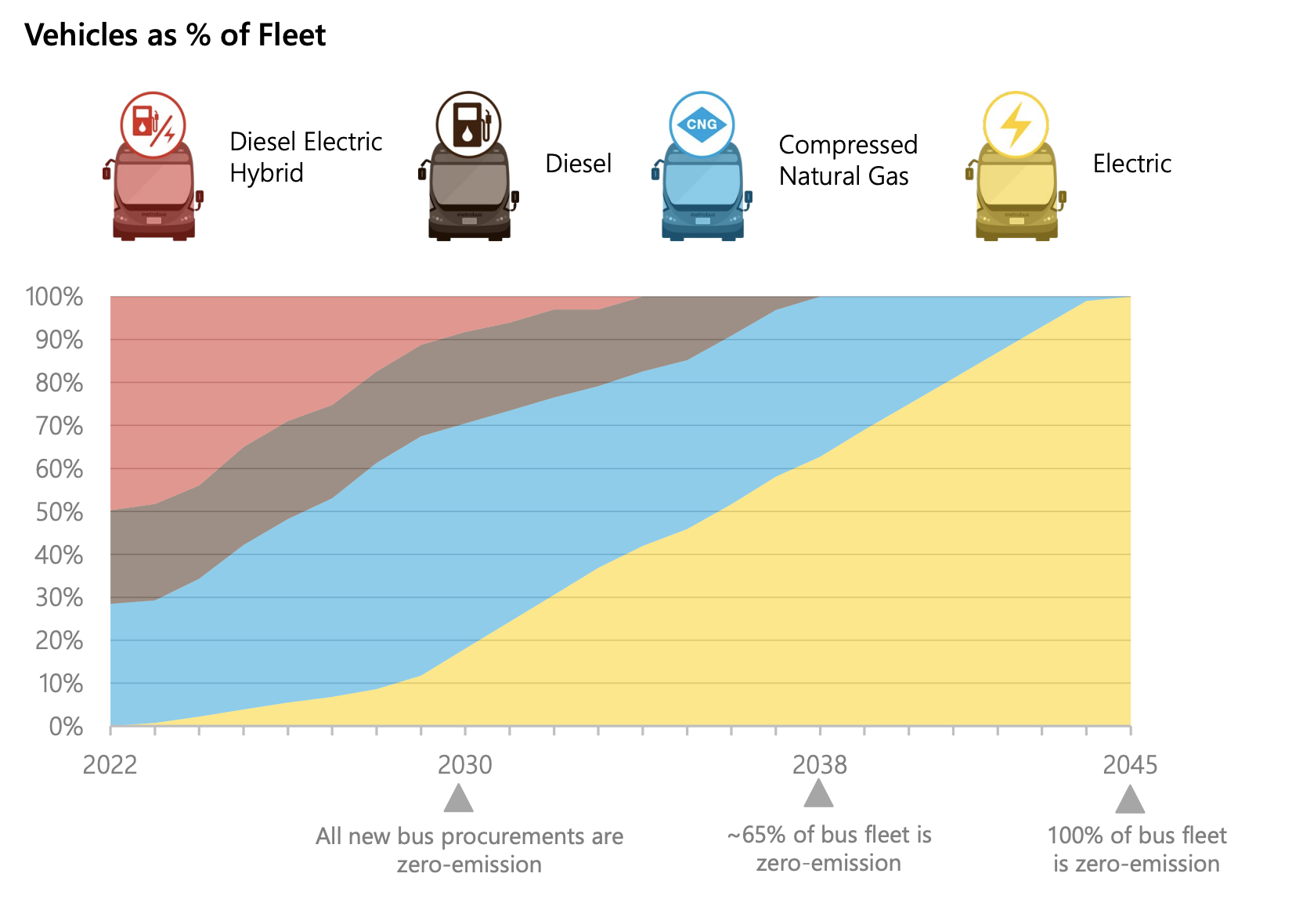 Metro plans to buy only zero-emission buses starting in 2030, with a goal of 65% of the fleet running on electricity or other zero-emission technology by 2038. This will translate to a 56% reduction in emissions by 2030, and a 78% reduction by 2038.