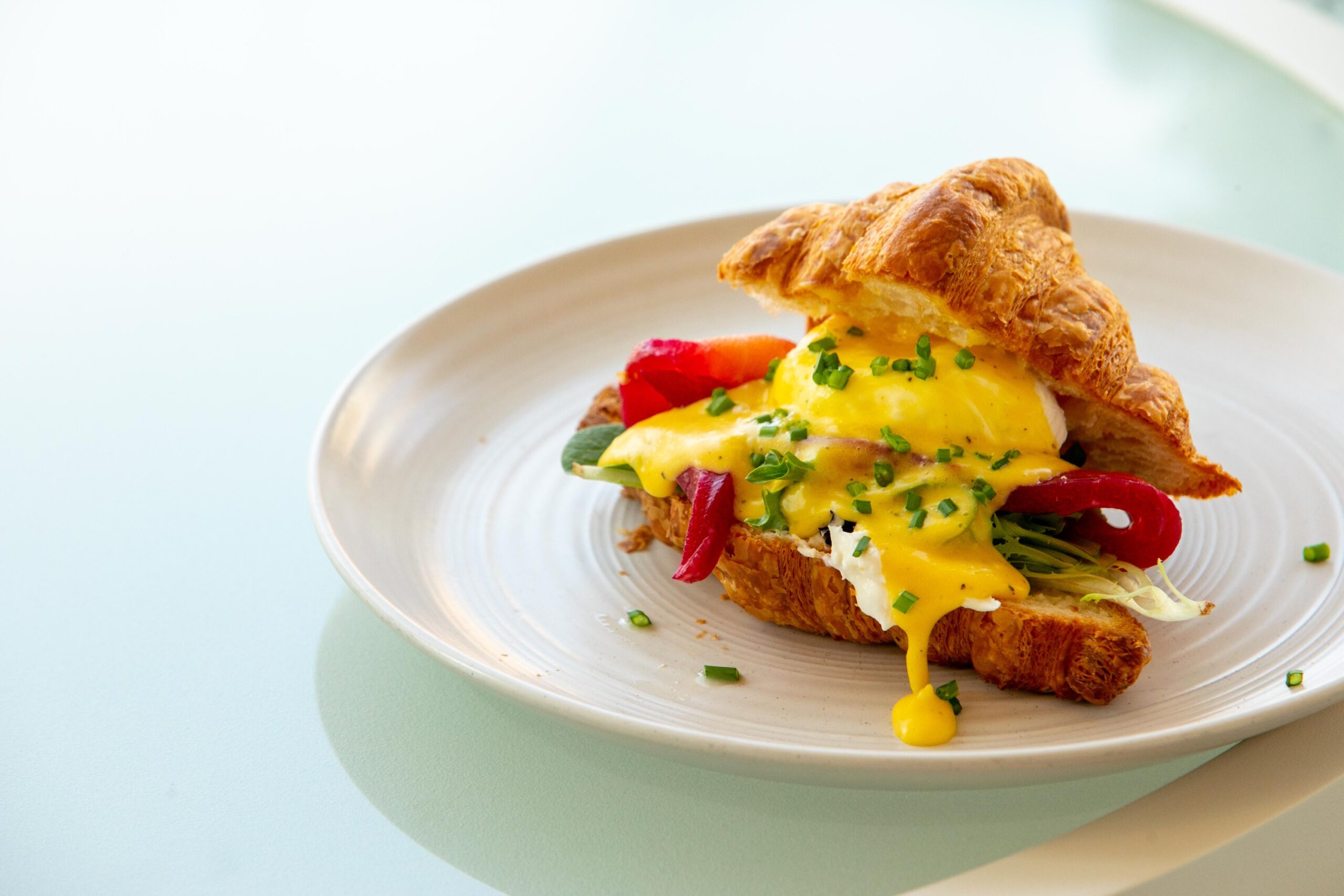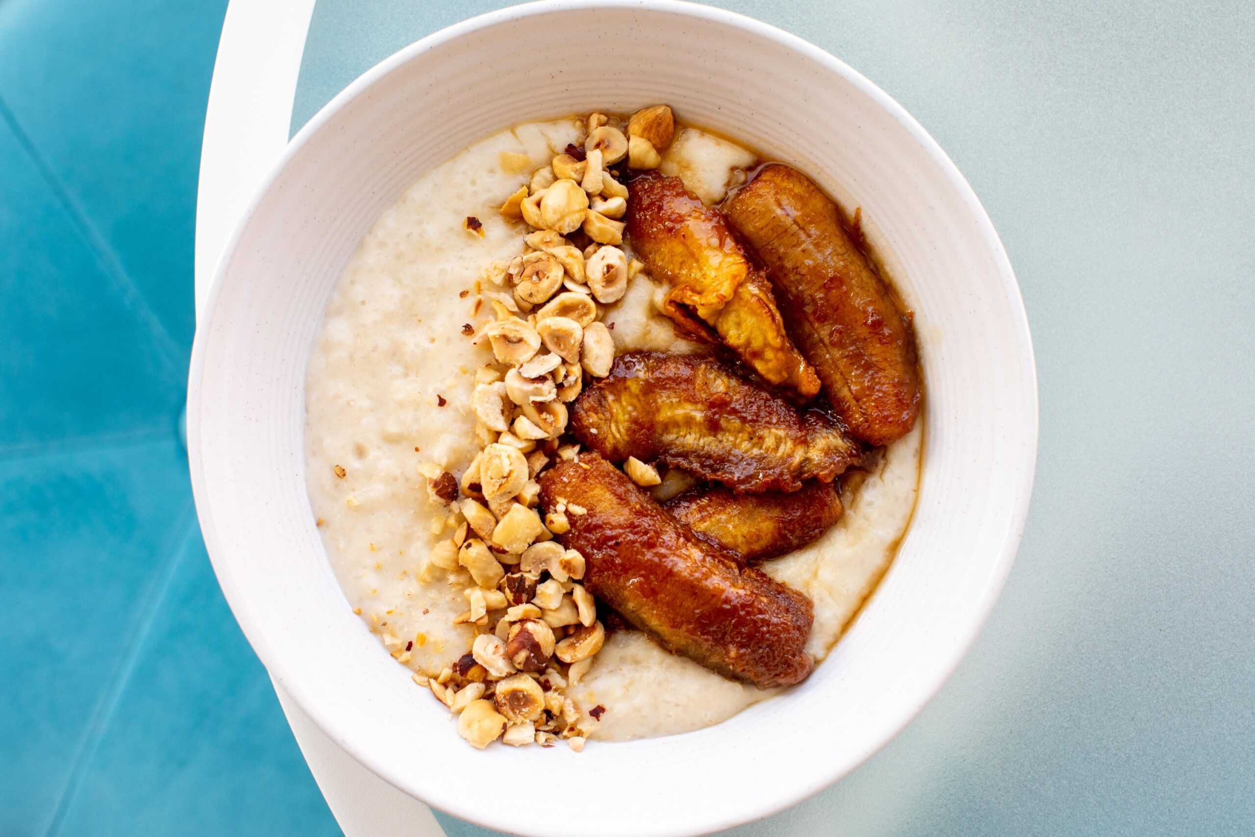 Served from open until close, the brunch menu features a broad array of dishes. There are toasts topped with eggs as you like them and your choice of a protein, including gravlax and halloumi cheese; a selection of avocado toasts; pancakes and waffles; shakshuka; and a couple of Benedicts. Three warm cereals – listed under ‘kasha,’ the Eastern European term for a cooked grain dish – are available, including savory oatmeal gussied up with salmon, mushrooms, and a poached egg. In a nod to the sisters’ homeland, there are syrnyky (cottage cheese pancakes) with a choice of preparations: with gravlax and mushroom gravy, sour cream and matcha custard, or caramel and roasted hazelnuts.