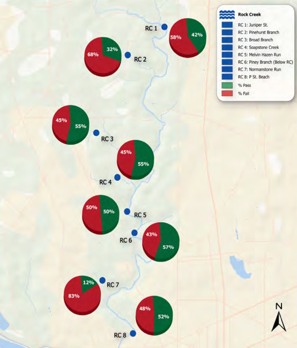 Rock Creek, the smallest of the three waterways, showed consistently dangerous levels of bacteria. When looking at bacteria levels averaged over time, six out of eight Rock Creek sites had a 0% passing rate.