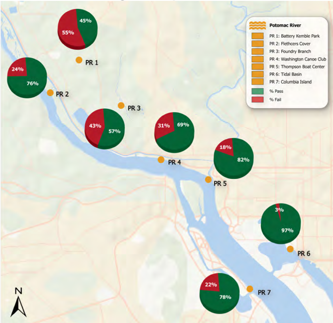 According to the report, five locations passed water quality standards for bacteria more than 80% of the time. Washington Channel (where the Wharf is located) passed 98% of time; the Tidal Basin passed 97%; Buzzard Point (on the Anacostia) passed 85%; Kingman Island (on the Anacostia) passed 83%; and Thompson Boat Center (on the Potomac) passed 82%.
