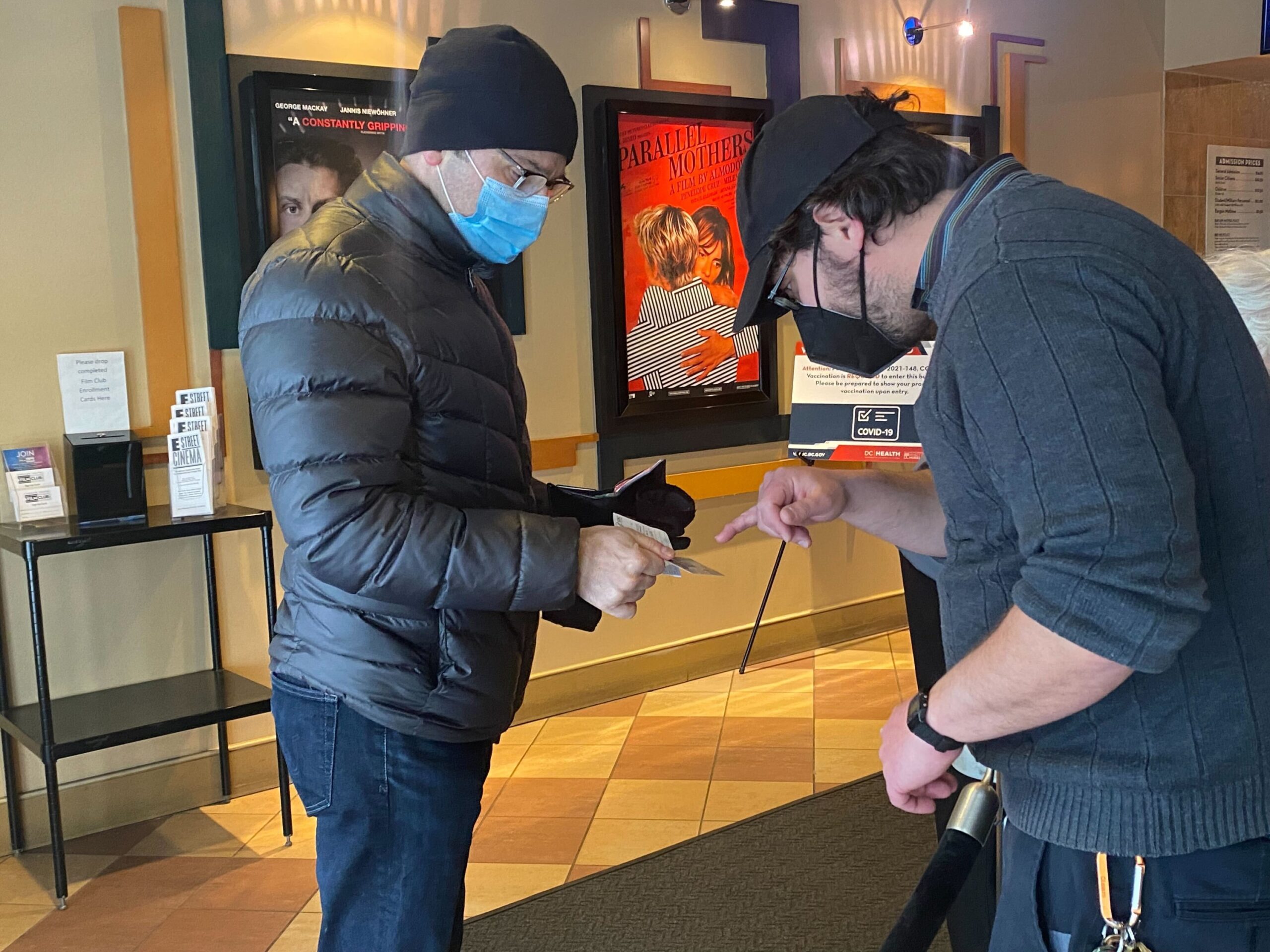 As Sarah Bryant headed into the E street Cinema on Saturday to catch a matinee of “Drive My Car,” theater workers greeted her near the door, asking to see her COVID vaccine card and ID. Once cleared, she and other moviegoers got a neon green wristband as proof they complied.
