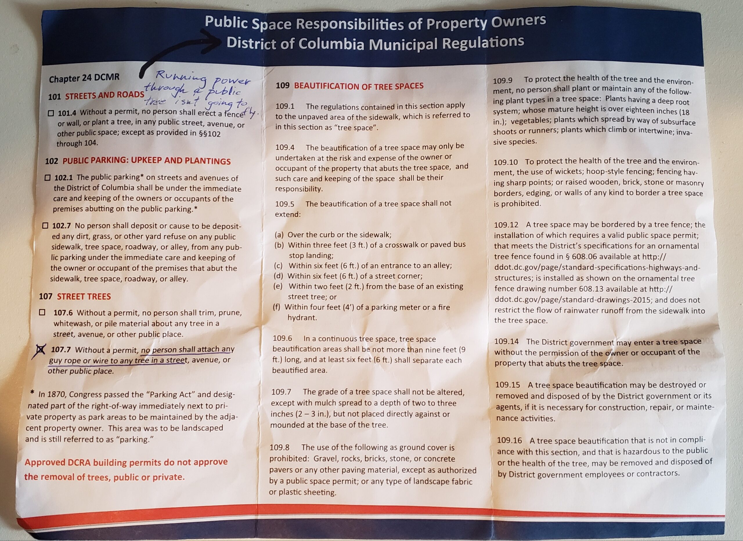 Days after our interview, he got a “nasty” note in his door…he doesn’t know who left it… it was written on a pamphlet titled “public space responsibilities of homeowners.” The handwritten note read “Running power through a public tree isn’t going to fly.”