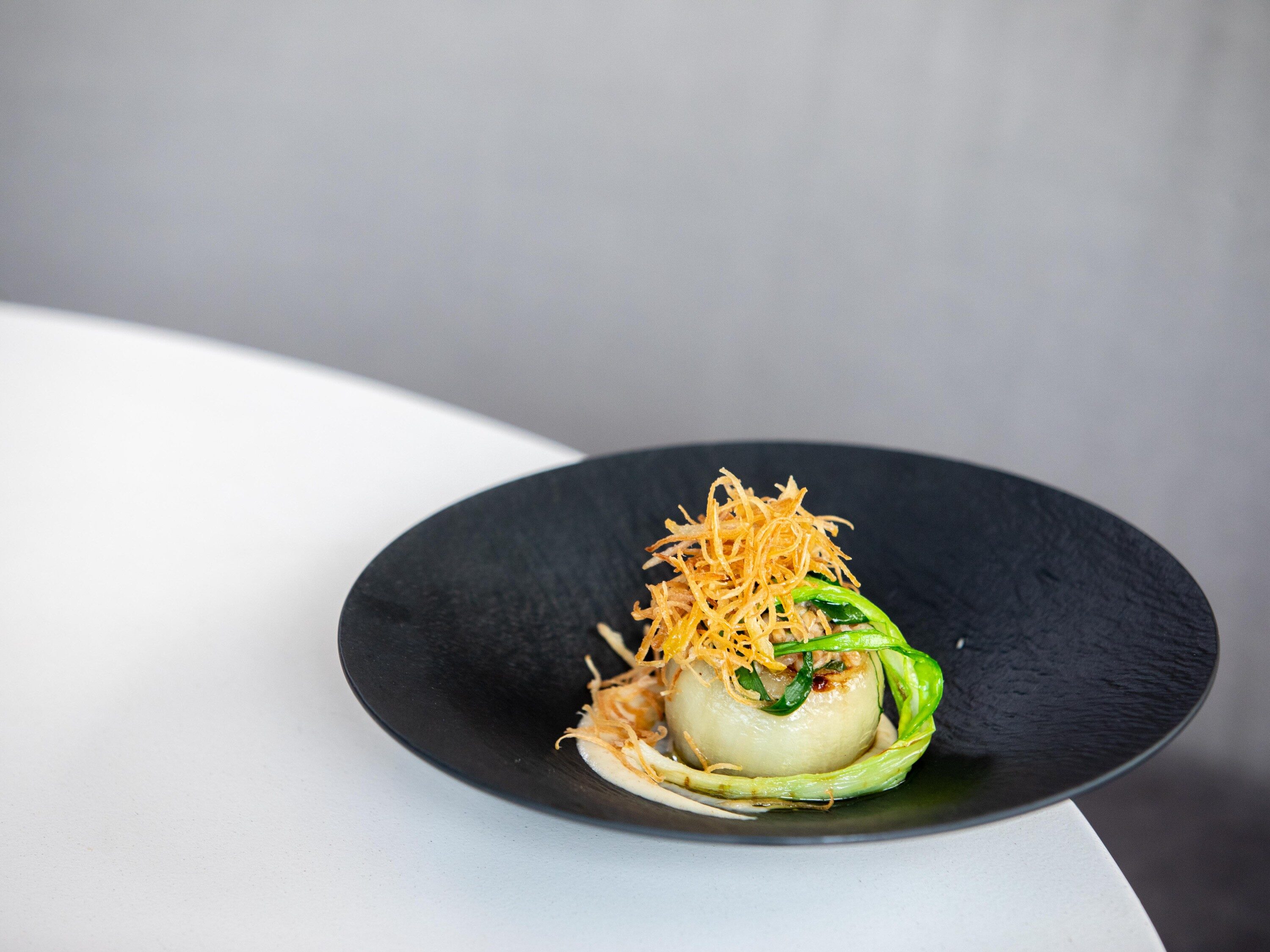 The tasting menu (starting at $108 per person) begins with a table full of seasonal nibbles. Recently, this included two-bite kounoupidi tiganites (cauliflower fritters), spanakopita (phyllo dough stuffed with spinach and feta), tiny triangles of feta, vinegar cured olives shipped from Sparta, and a savory loukoumades — a beignet-like puff of fried dough that is stuffed with creamy taramasalata (Greek fish roe dip) and topped with a crown of caviar.
