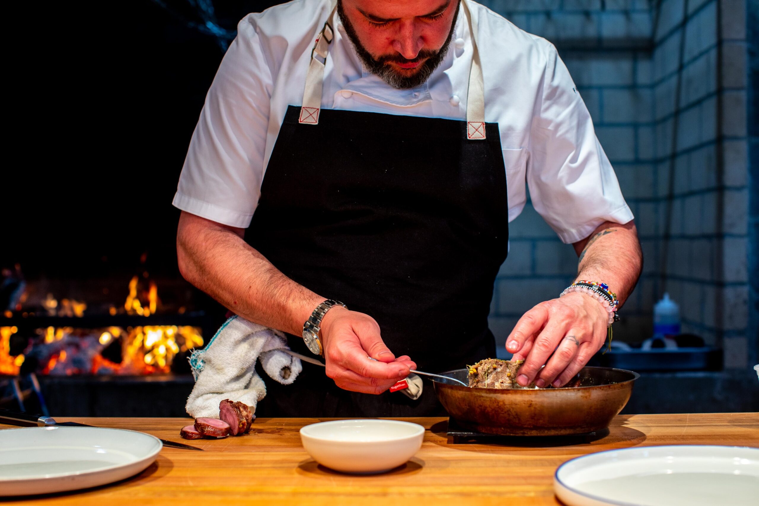 Today, diners are hit with the scent of sweet smoke from the wood burning hearth at the center of the open kitchen when they walk through the restaurant’s front doors. The dining room has 62 seats under its cathedral ceiling and massive windows with views of downtown D.C. Eucalyptus branches adorn the walls and woven rope light fixtures hang from the center of the room.