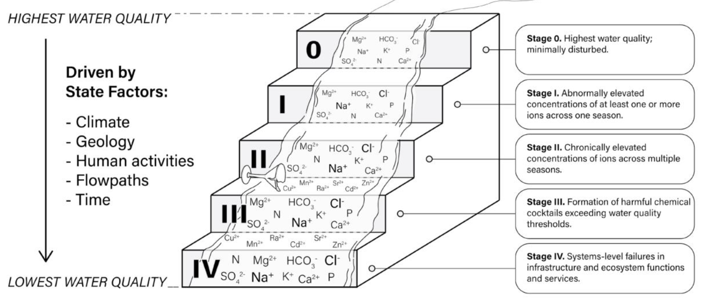 Under Kaushal’s framework, in Stage 3 waterways, salt ions begin to interact with compounds in the environment, creating harmful “chemical cocktails.” As Kashaul explains, salt ions displace metals, nutrients and even radioactive elements, releasing them into the water.