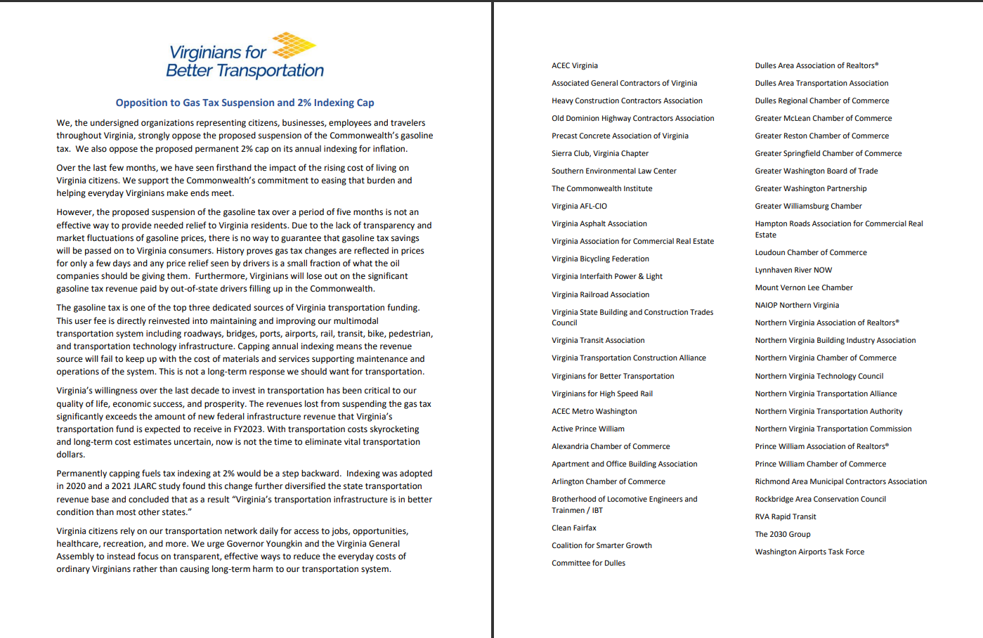 “We support the Commonwealth’s commitment to easing that burden and helping everyday Virginians make ends meet,” the group wrote. “However, the proposed suspension of the gasoline tax over a period of five months is not an effective way to provide needed relief to Virginia residents.