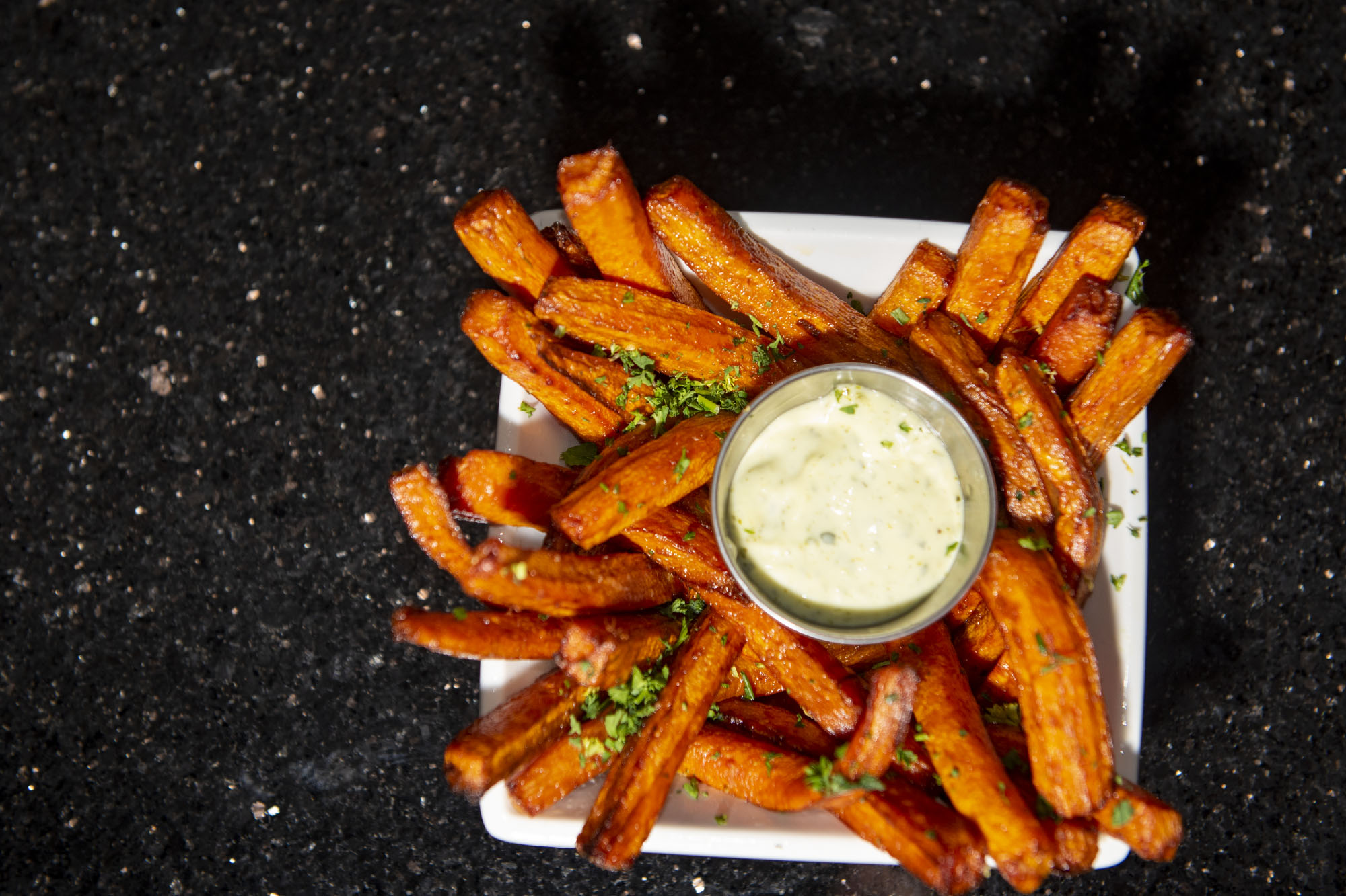 Flash-fried carrot fries stand in for french fries in a dish that provides green goddess dressing as a dipping sauce. Sweet potato fritters, lamb meatballs and toasts topped with goat cheese and mushrooms are also some other options not typically found at sports bars.