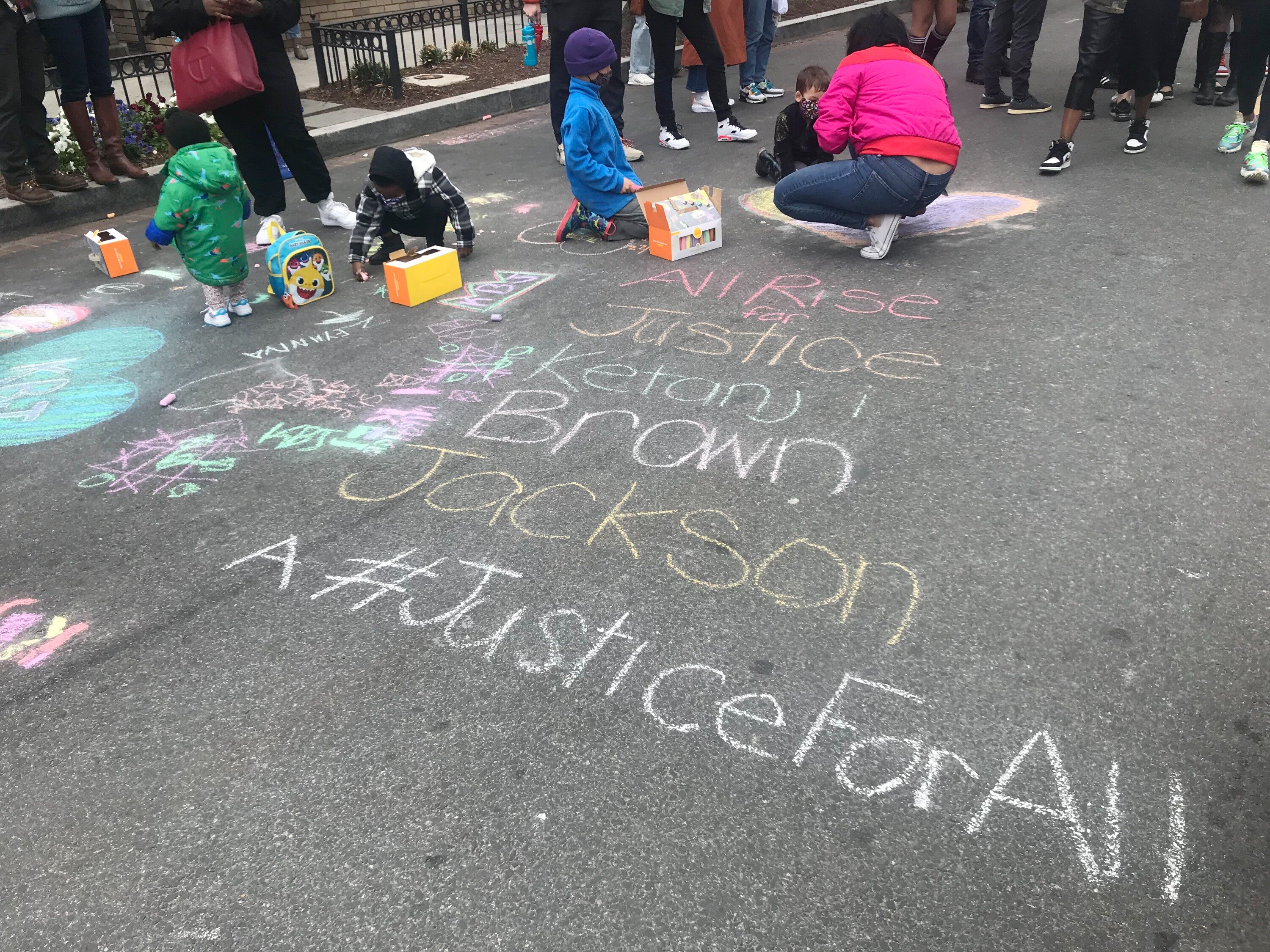 The gathering was held at the site of an in-progress mural depicting Jackson and featured performances by the Howard University marching band, rapper Fly Zyah, and the go-go band Be’la Dona, as well as a slate of speakers. In the closed off streets, people held up signs in support of the judge, wrote chalk messages, and played double Dutch. Several speakers led calls of “When I say Black women, you say lead,” which the crowd eagerly responded to, along with whoops and the ringing of bicycle bells.